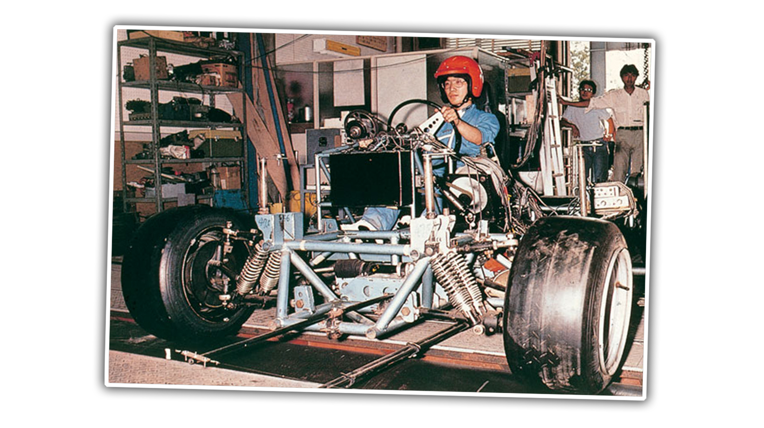 A key benefit of the joint research was the drum-type bench tester installed in Oguchi's laboratory. It was a device made of two drums placed in parallel at the front and back. A test car made of pipe frames was placed on top of the tester. The tester could evaluate maneuverability and stability under various conditions by changing the gearbox setting in order to obtain the desired steering ratios for the front and rear wheels. With this device Sano and Furukawa could substantiate their theory through the collection of quantifiable data. They also acquired other data, including an optimal steering ratio for the rear wheels. This proved very useful when filing the patent application for their aforementioned technology.