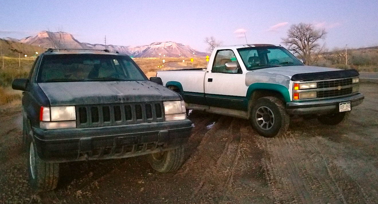 "If you're 100% committed to this insanity," he continued, "I've got a couple mountain worthy beaters you can borrow. One is a beat up '05 Suzuki XL7, and the other an even more beat up '93 Chevy 3/4 ton 4x4." Both of them were equipped with snow tires.