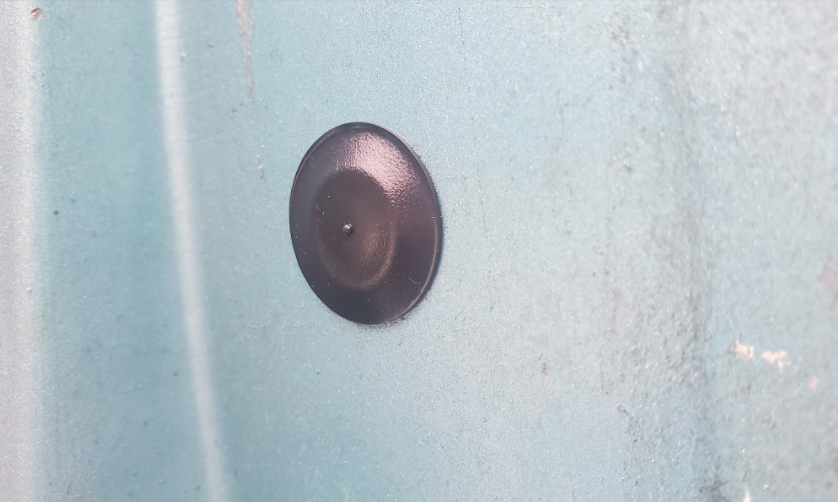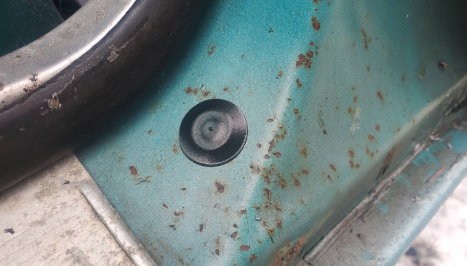 Here's a closer look at the rubber plugs that Krown installed into the holes that George drilled into my Valiant's body:
