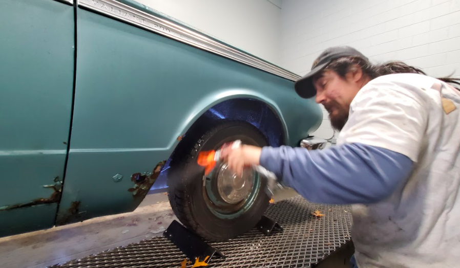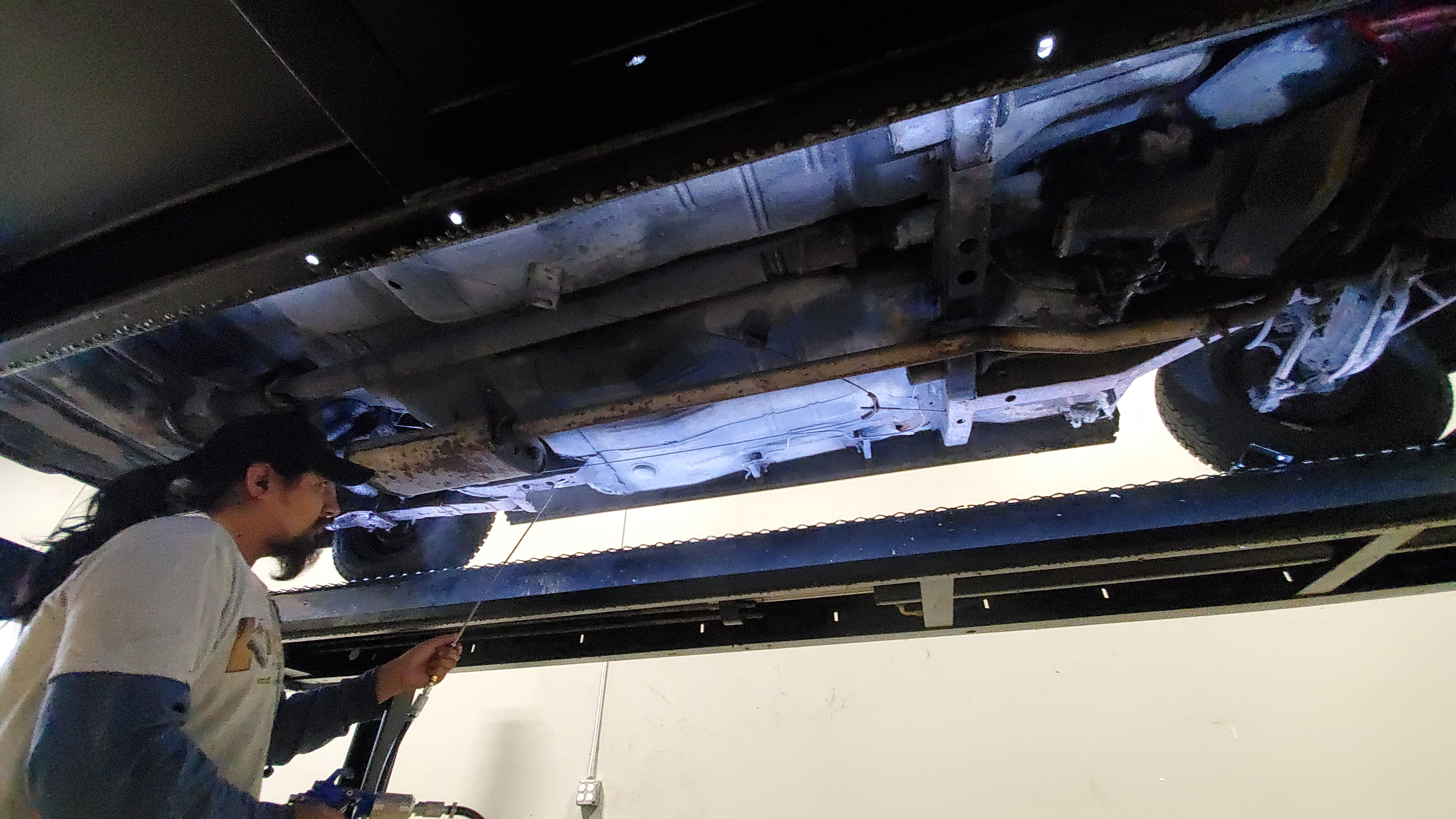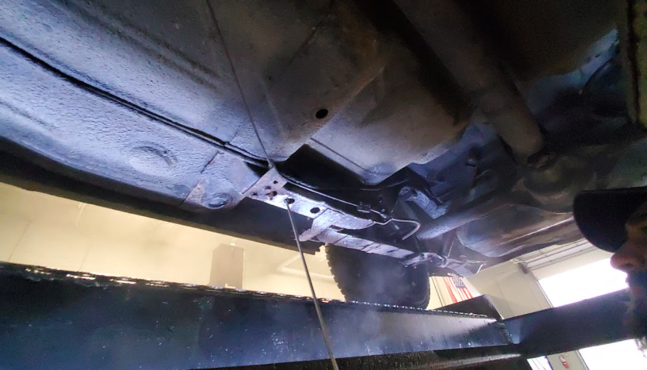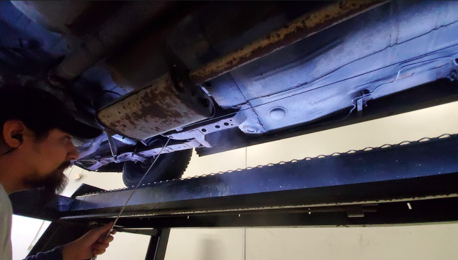 With the car in the air, it was time for one last job for the wand. George shoved the thing into the holes in the main unibody rails.