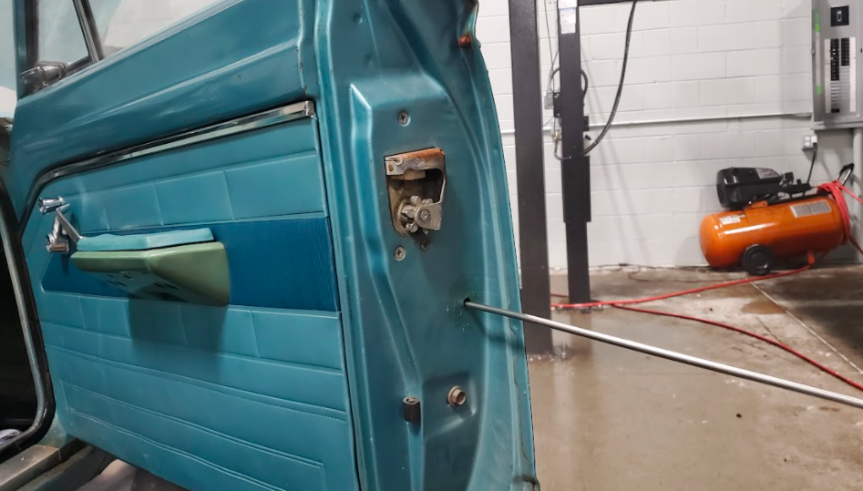 George drilled holes in a number of locations, all of which were hidden from view. In the image above, he's drilling a hole into the rear passenger's-side door to later coat its interior surfaces with a film of oil.