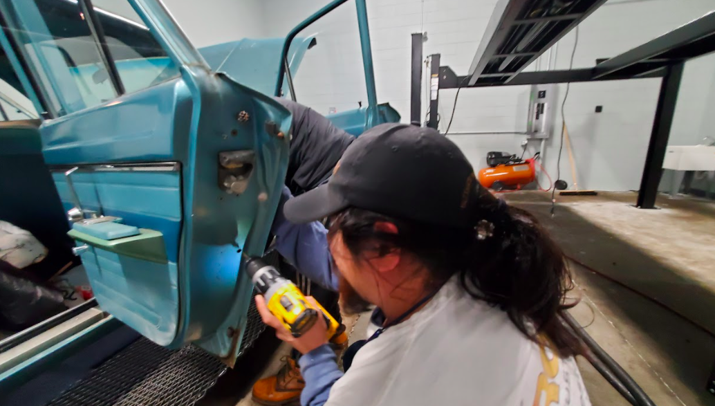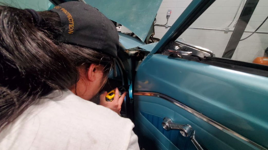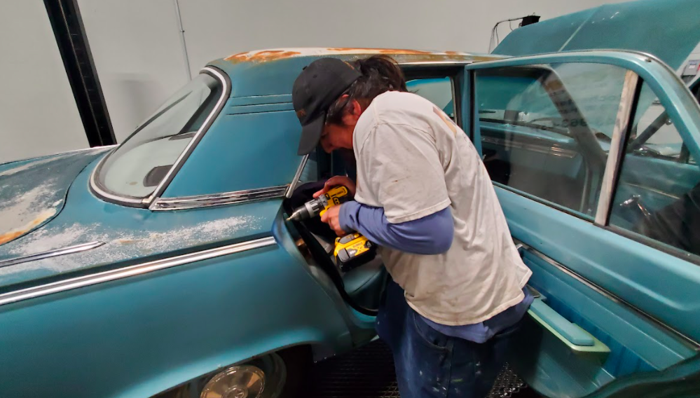 The image above shows George drilling into the rear quarter panel via the door jamb.