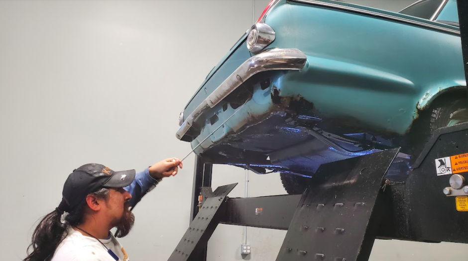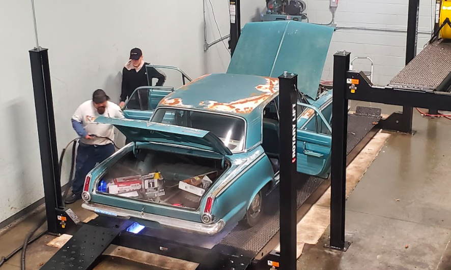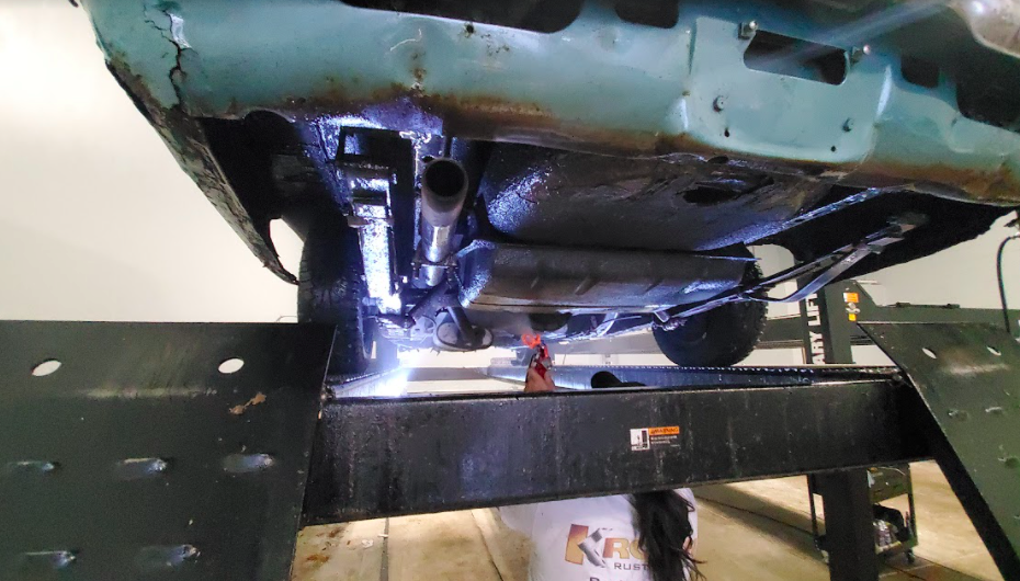 With my 1965 sedan's body injected with oil, it was time to raise the vehicle on the hoist.