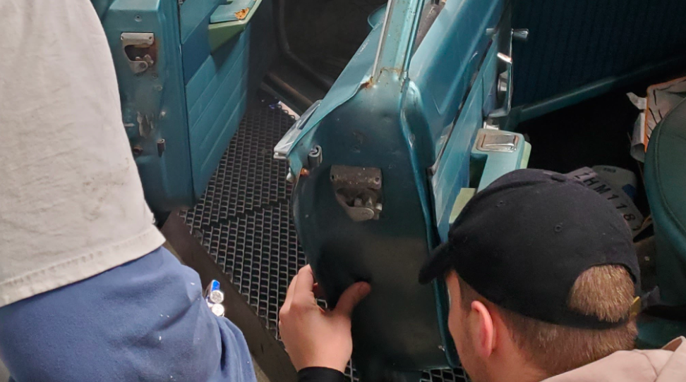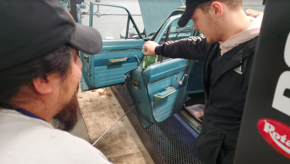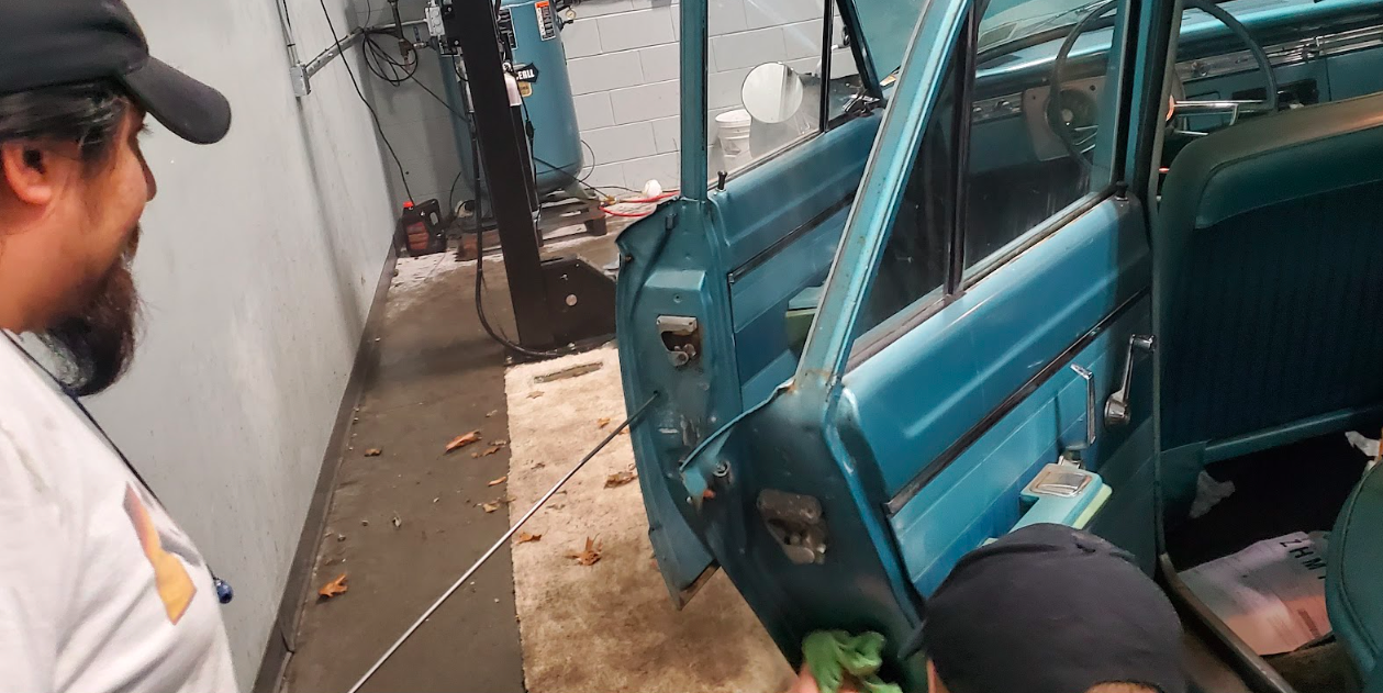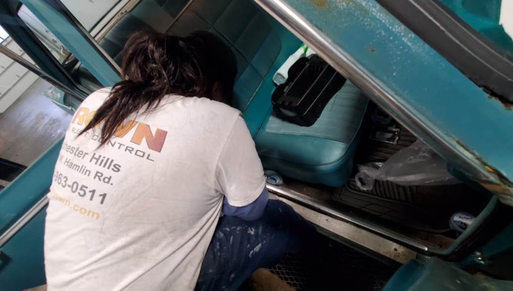 Above you can see George drilling into my rocker panel from the top, also in the door jamb.