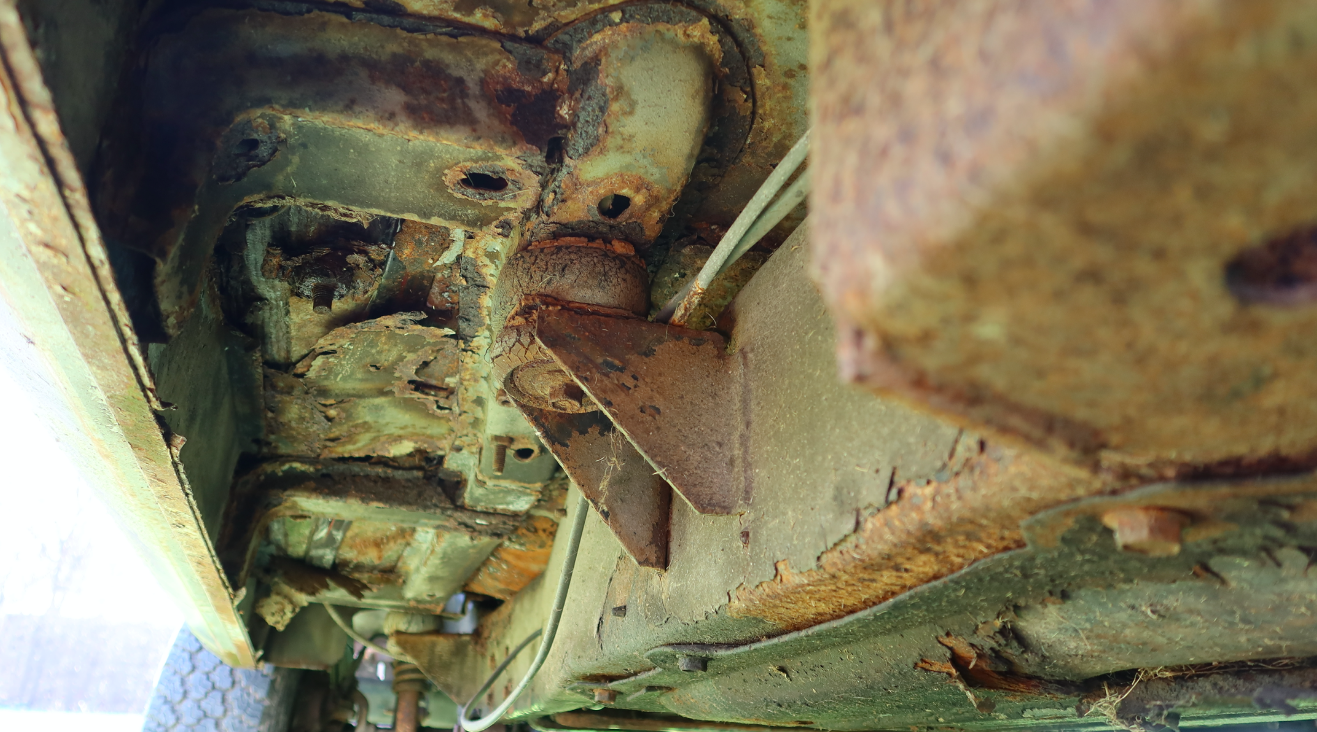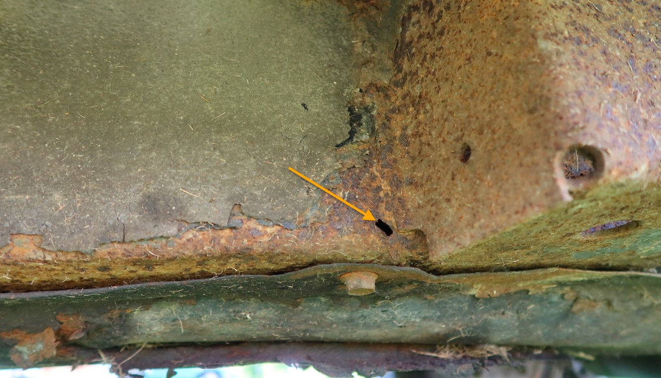 I also found a tiny hole in the frame near the fuel tank. It doesn't seem like a major issue, and poking around that hole seems to reveal reasonably strong metal. But this is something that should probably be hit with a welder soon:
