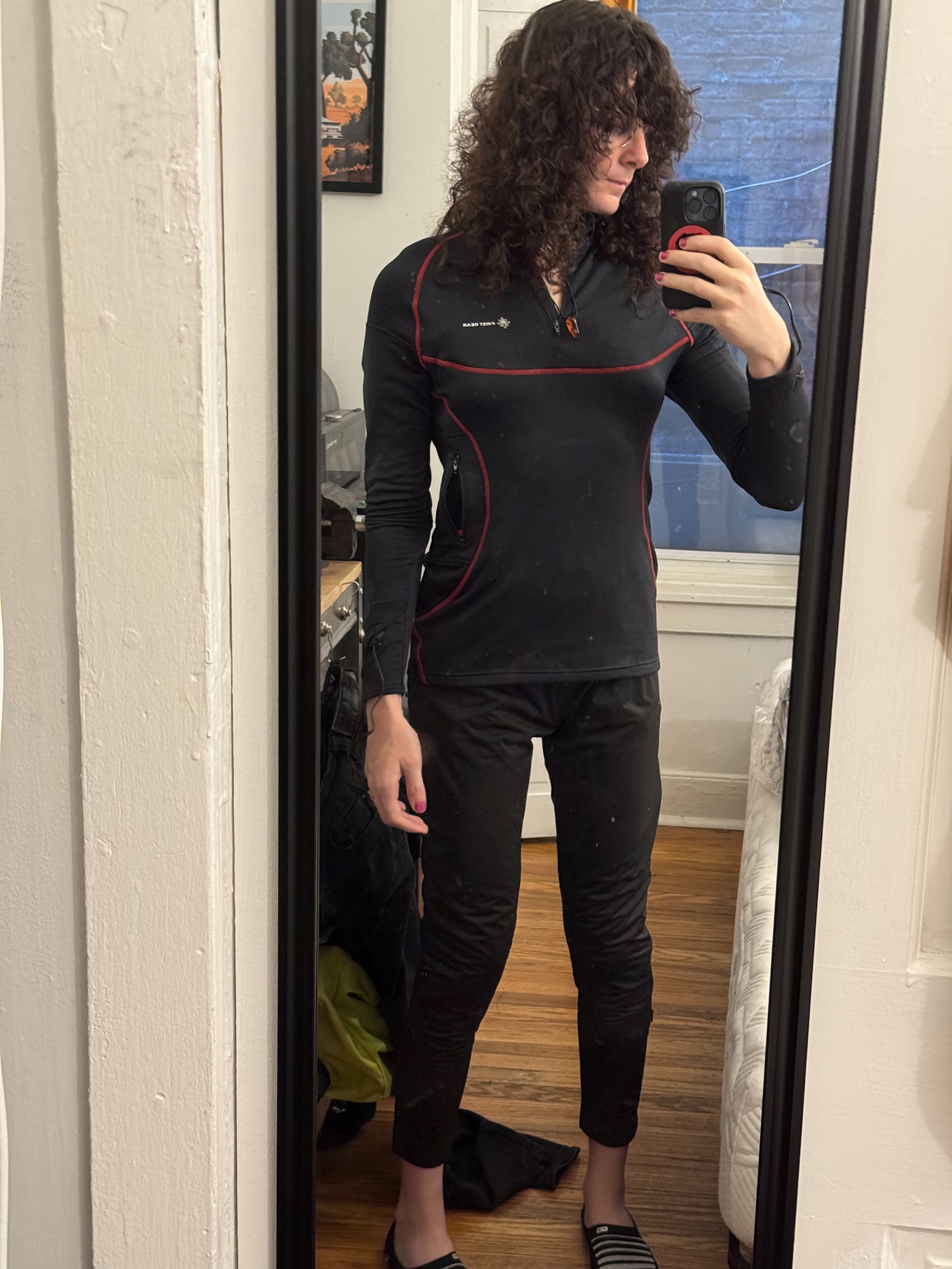 Pant liners, a quarter-zip top, and glove liners. I have boot liners around too, somewhere, but I can't find them. Ordinarily pieces like this wouldn't keep much heat in, but these are heated on their own. Each part of the assembly either plugs into the bike or plugs into another garment, and it's all controlled by a box that sits on my hip. Sort of. We'll get to that.