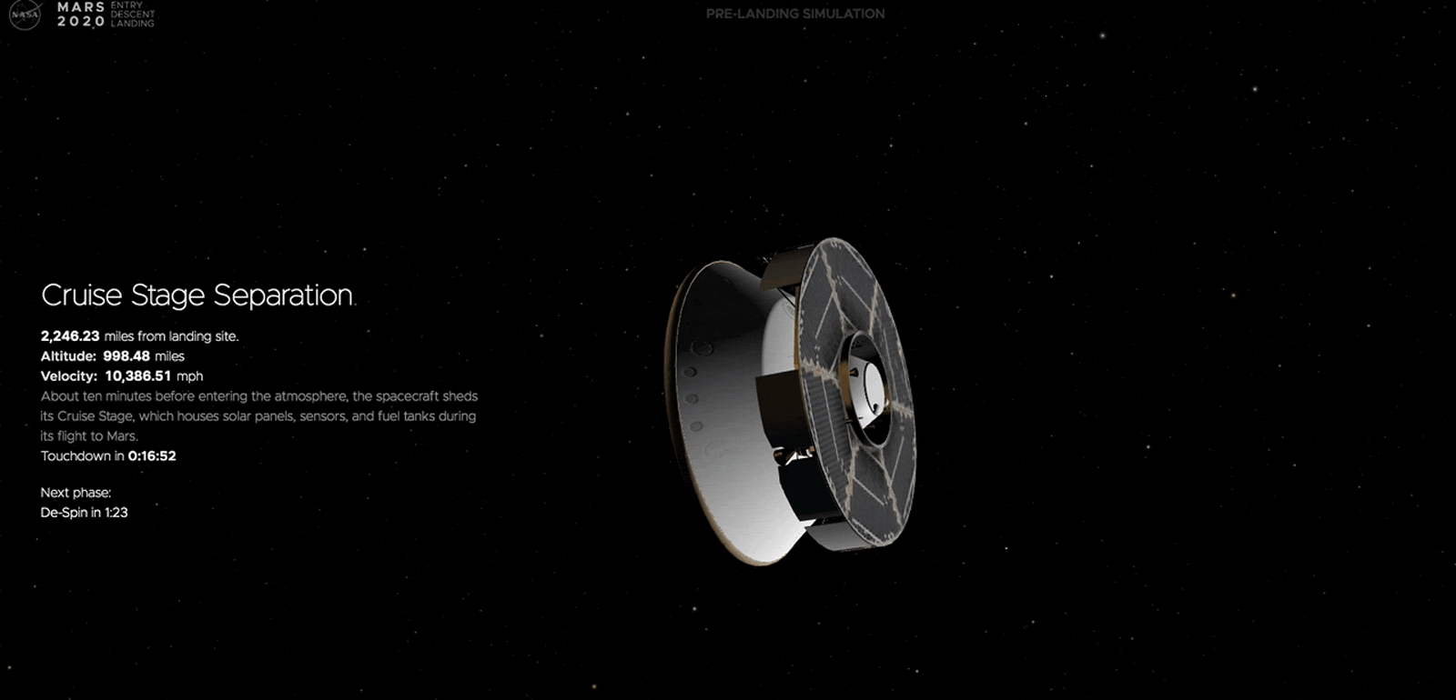 Having been delivered precisely to the top of the Martian atmosphere, it was time for the vehicle to start the process of landing. Ten minutes before the spacecraft hit the top of the Martian atmosphere, and about 17 minutes prior to the rover landing on the surface, the cruise stage was separated from the backshell and went on to burn up in the Martian atmosphere.