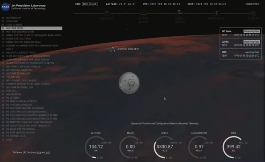 Before starting to use the thrusters, during the 2.4 seconds of free fall, Perseverance chose precisely where to land based on the current information. EDL systems engineer Erisa Stilley explained: "Once Perseverance has a better sense of where she's at, she then uses a second onboard map, based on where we can currently divert to in that point in time, and searches that area to find the safest place she can fly to."