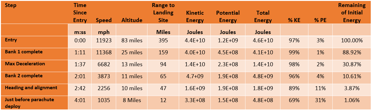 Here's a look at the changes in the speed, altitude, range to landing site, and potential and kinetic energy during the steps we've talked about so far. We'll continue to look at this table as we talk through the rest of the steps of EDL.