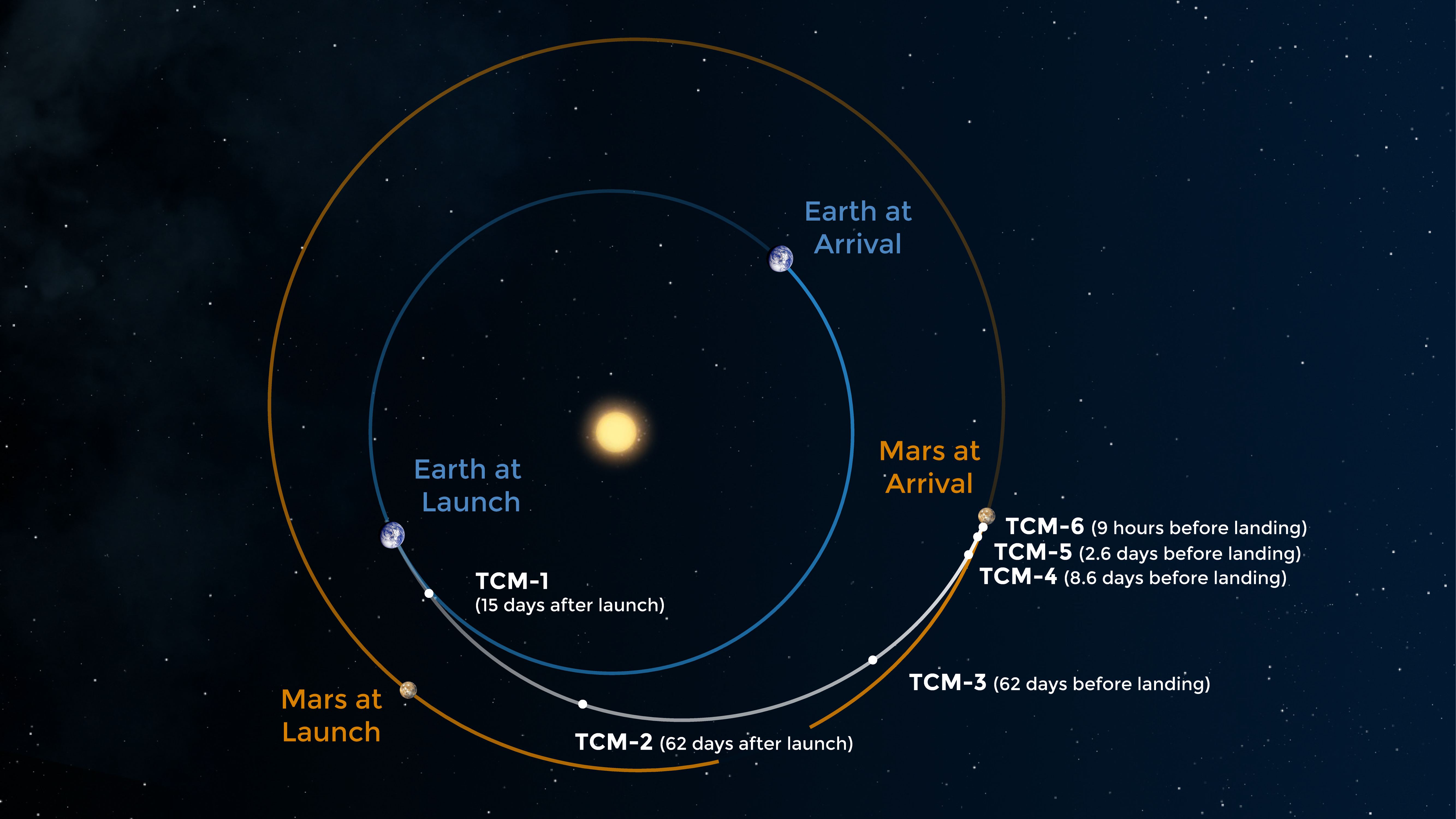 The launch vehicle itself was not precise enough to ensure the spacecraft arrived at the aim point, so the engineering team designed in the capability to track the spacecraft's transfer orbit, and to make adjustments to its trajectory so that it would arrive precisely when and where the team was aiming. These opportunities to make the adjustments to the orbit are called Trajectory Correction Maneuvers or TCMs, and the team planned to use up to six of them.