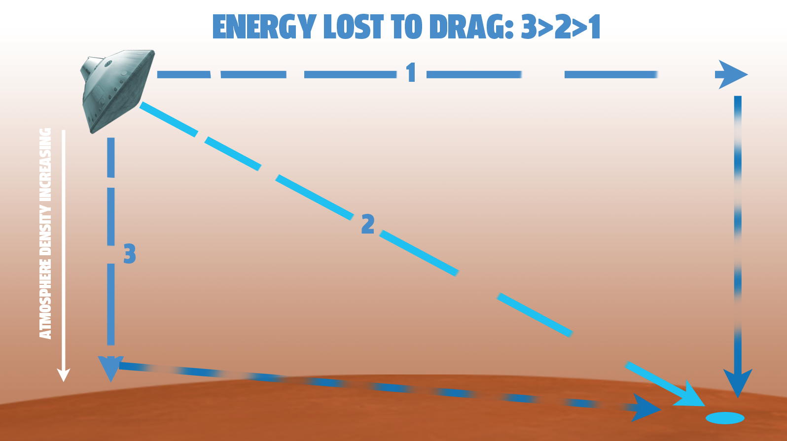 During entry and descent, the vehicle slowed because of atmospheric drag (think of the force on your hand when you hold it out the window of your moving car). Atmospheric drag becomes stronger at a given velocity if the vehicle is running into more air. The air becomes exponentially denser (you can think of it as there being "more air") the closer the vehicle is to the ground, so if the vehicle wants to slow down at a higher rate, it needs to descend faster. If the vehicle wants to slow down at a lower rate, it needs to descend slower. (Note drag is proportional to the density of the air and the square of the velocity). The image below is a vast oversimplification, but illustrates the point: