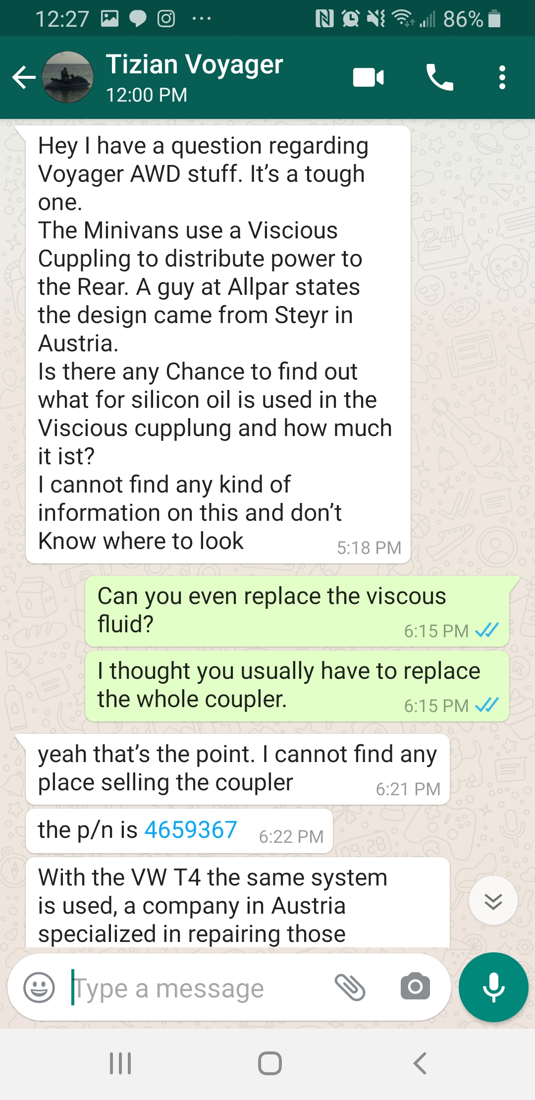 Tizian and I have been in contact since our meeting in October, discussing Voyager-related nerdiness. Look at this random question about the silicone oil found in the Voyager all-wheel drive system's viscous coupling unit: