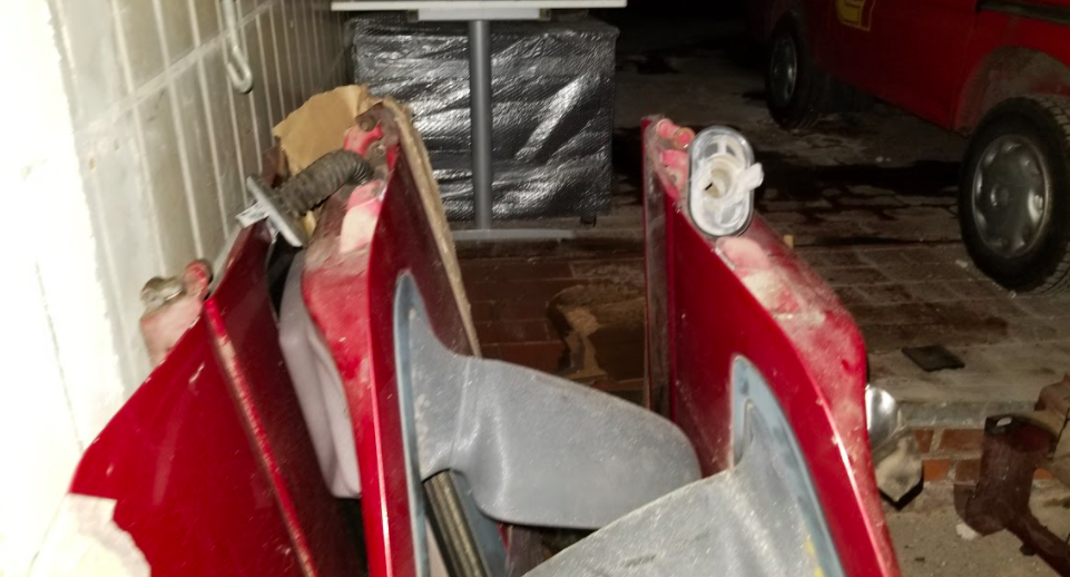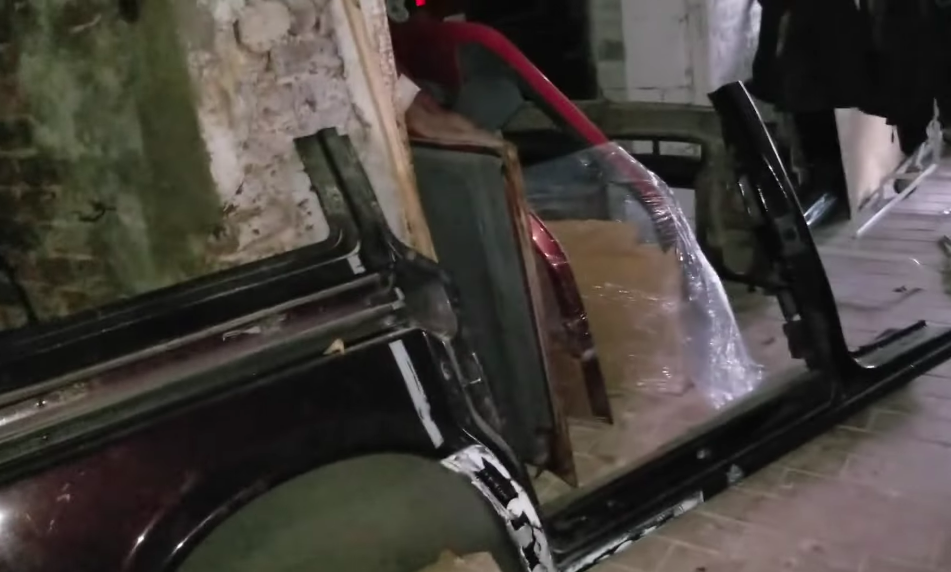 To fix the purple LE Competition's rust, Tizian and Leander plan to graft in pieces from another LE Competition that they hacked up. Here's a look at one of the donor car's Michigan-designed body-side-outer panels just sitting against a crumbling brick wall in this old mill building in Germany:
