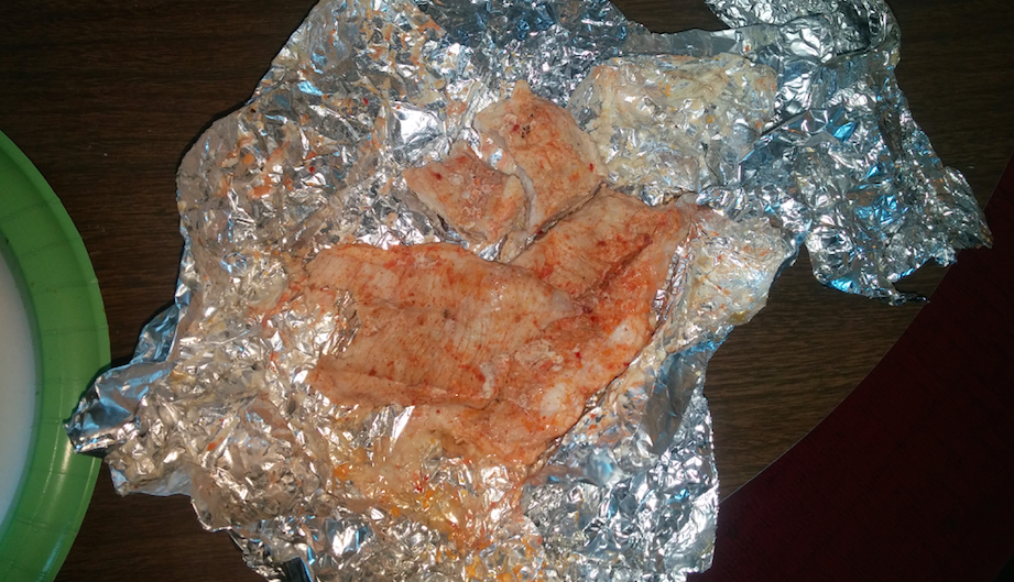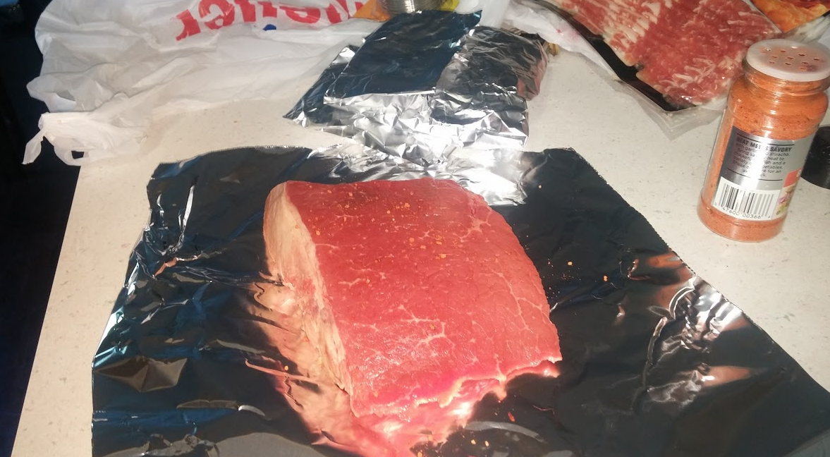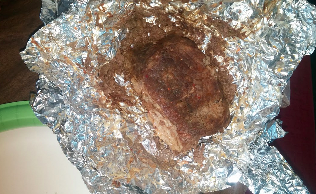 As for packaging, I followed Manifold Destiny's advice by wrapping the meat in three layers of aluminum foil, alternating which side had the seam. This makes a lot of sense, as the layers of foil keep the juices in, but are also tough enough to allow me to cram the food package into little nooks and crannies without worrying about tearing and contamination.