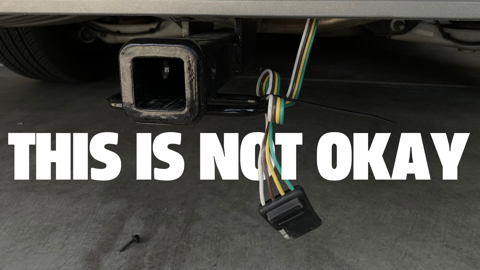 The Buick hitch package, with two hours of installation labor, was just shy of $600. To say I was slightly miffed by the fact that our trailer wiring harness was zip tied to the hitch's safety chain loop is an understatement. For the cash we shelled out, I would have imagined a bit nicer of a finish to the job. *sigh* For one thing, the harness plug is just hanging out there in the elements. For another, the trailer's safety chain could easily break that zip tie and with that much slack the wire harness could easily come into contact with the road, which is no bueno.