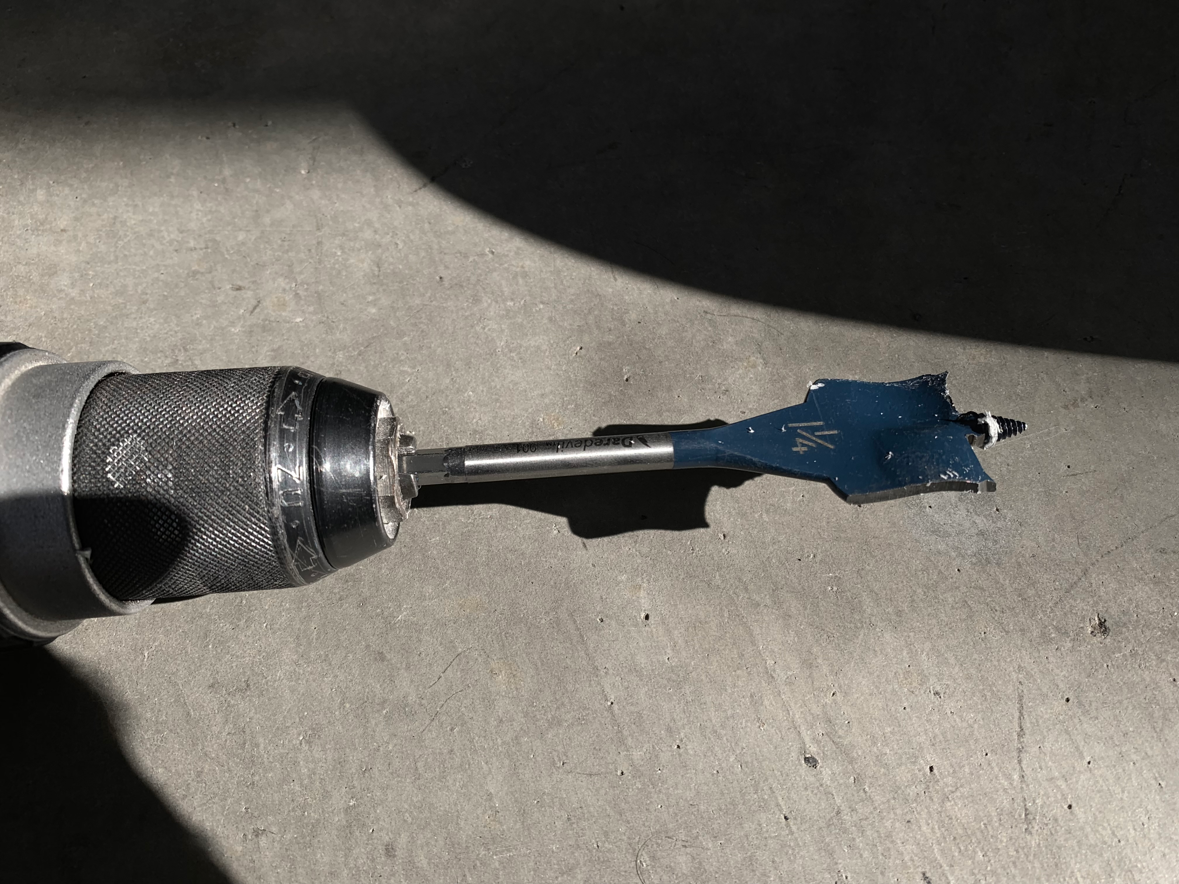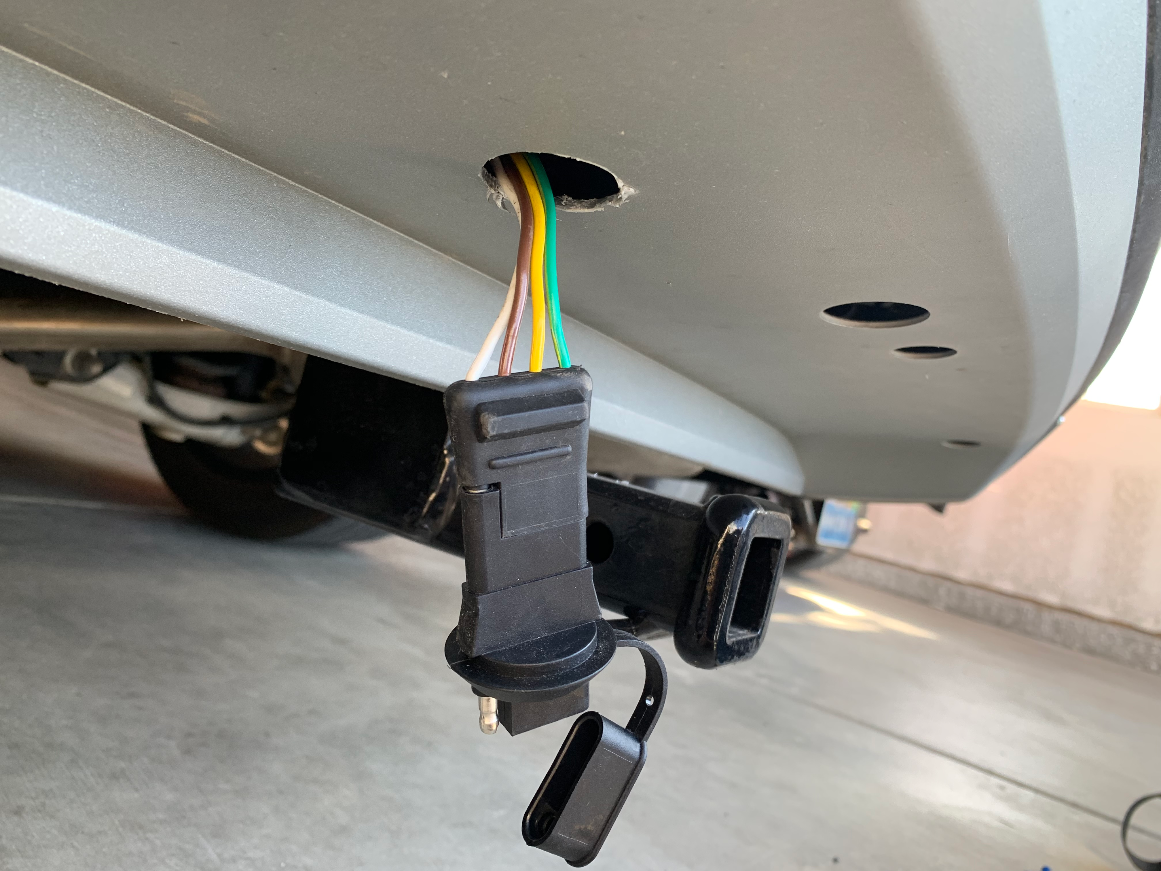 I picked a spot in the bumper I could easily reach, and on the side of the hitch where our trailer's harness exited the frame for simplicity sake. Then I let my magic Bosch drill bit eat. I was at a funny angle, and the fresh bit was sharp and ready to mar the plastic. It's not my best work, and I'm not particularly proud of it, but it's completely hidden in the finished product, so I'll try not to let it bother me for the rest of my life.