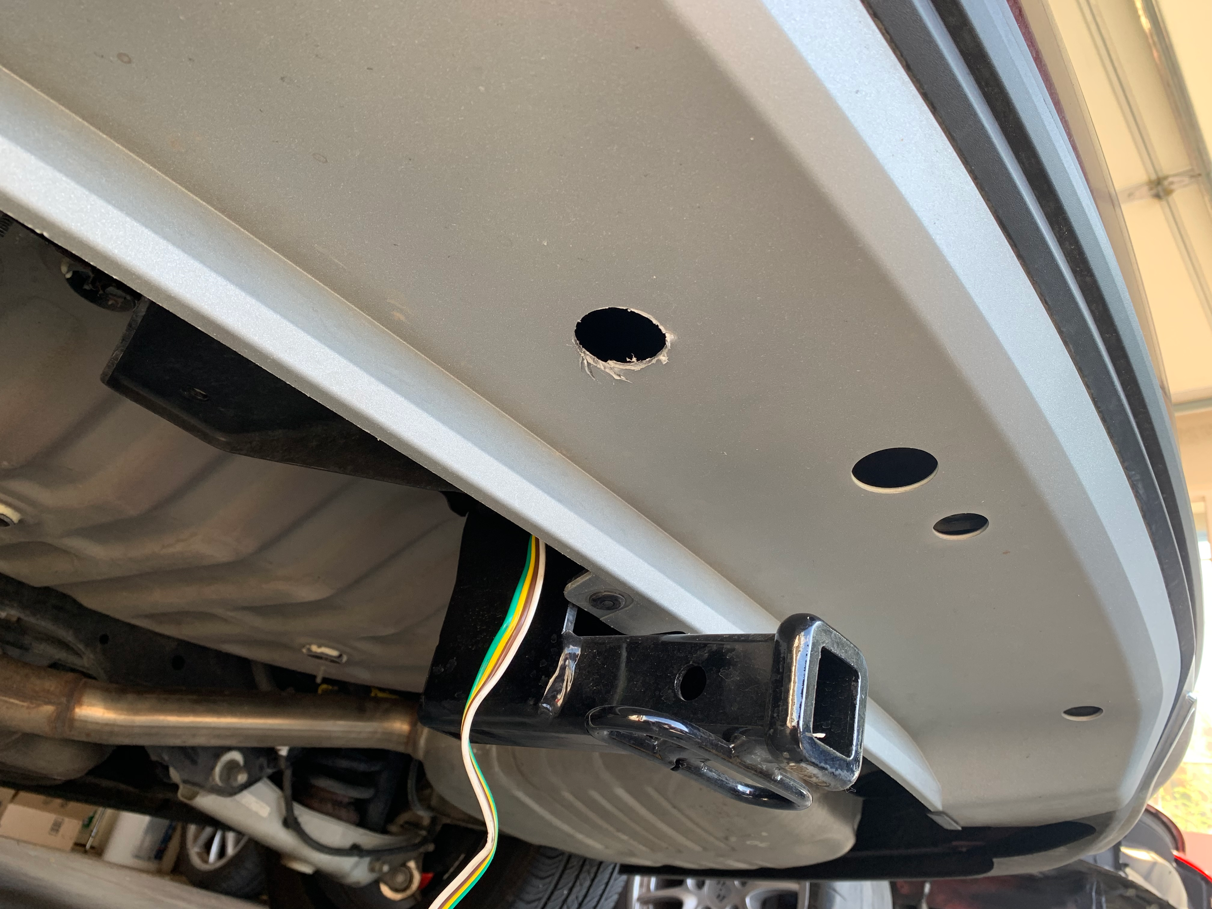 The finished result looks like the $600 I spent probably should have in the first place. Hell, if the Buick dealer didn't want to drill into our bumper, they could have used the existing correctly-sized hole already in the bumper (visible above) for the factory puddle light (which is partially blocked by the hitch anyway, below).