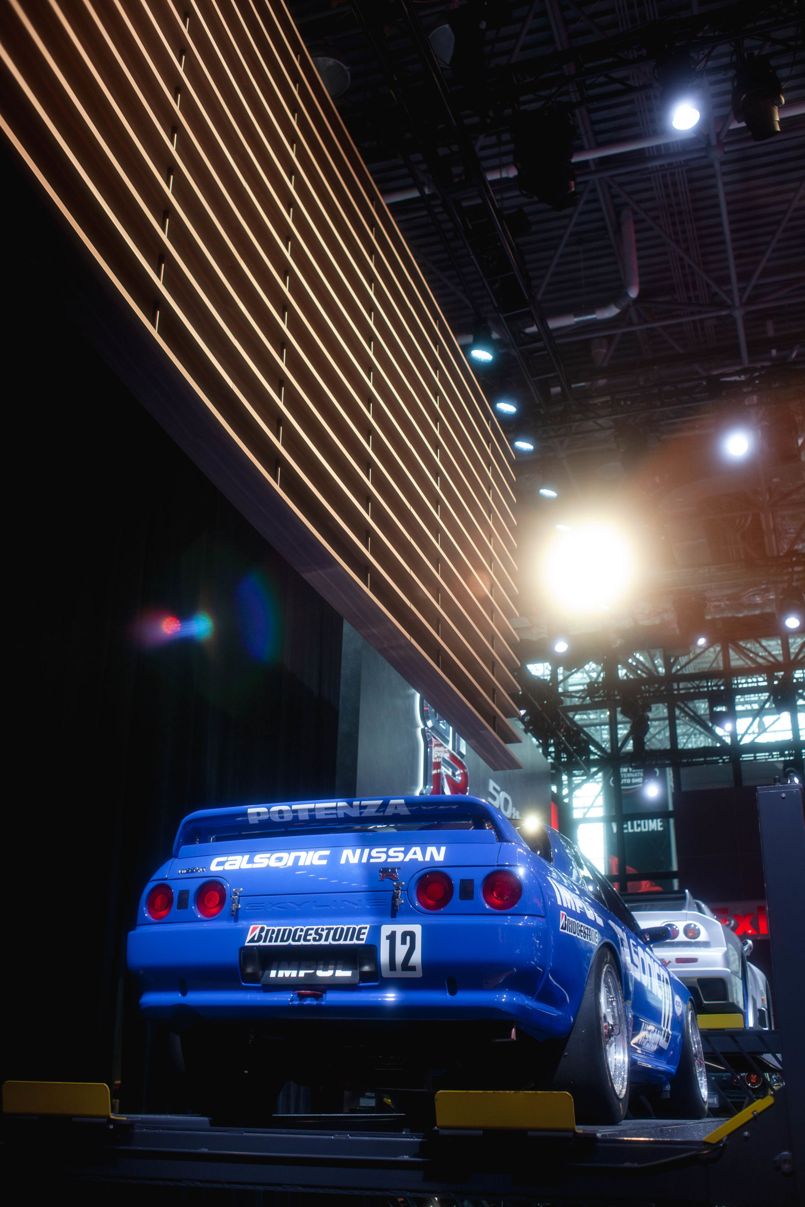 In the photos above and below, note how the white "CALSONIC" lettering is picking up the stage lights and beginning to glow. The reflections in the chrome wheels are also softened, and any strong sources of light, like those on the ceiling of the building, are blown out into soft glowing orbs instead of harsh stars or smears.