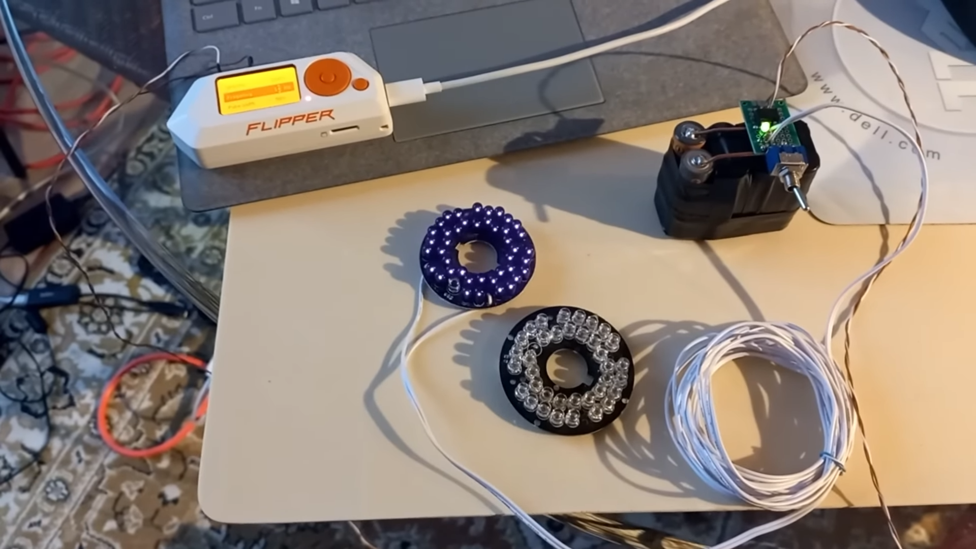 So, Fairlie wired in the infrared LED array from a security camera. He knew what flash frequencies the traffic lights near him would look for — 10, 12, and 14 Hz — so he set the Flipper to generate that frequency and sent it out over GPIO pins. With the more powerful infrared array cycling at the proper rate, Fairlie had built a DIY emergency vehicle transmitter — he could snap his fingers and turn red lights green.