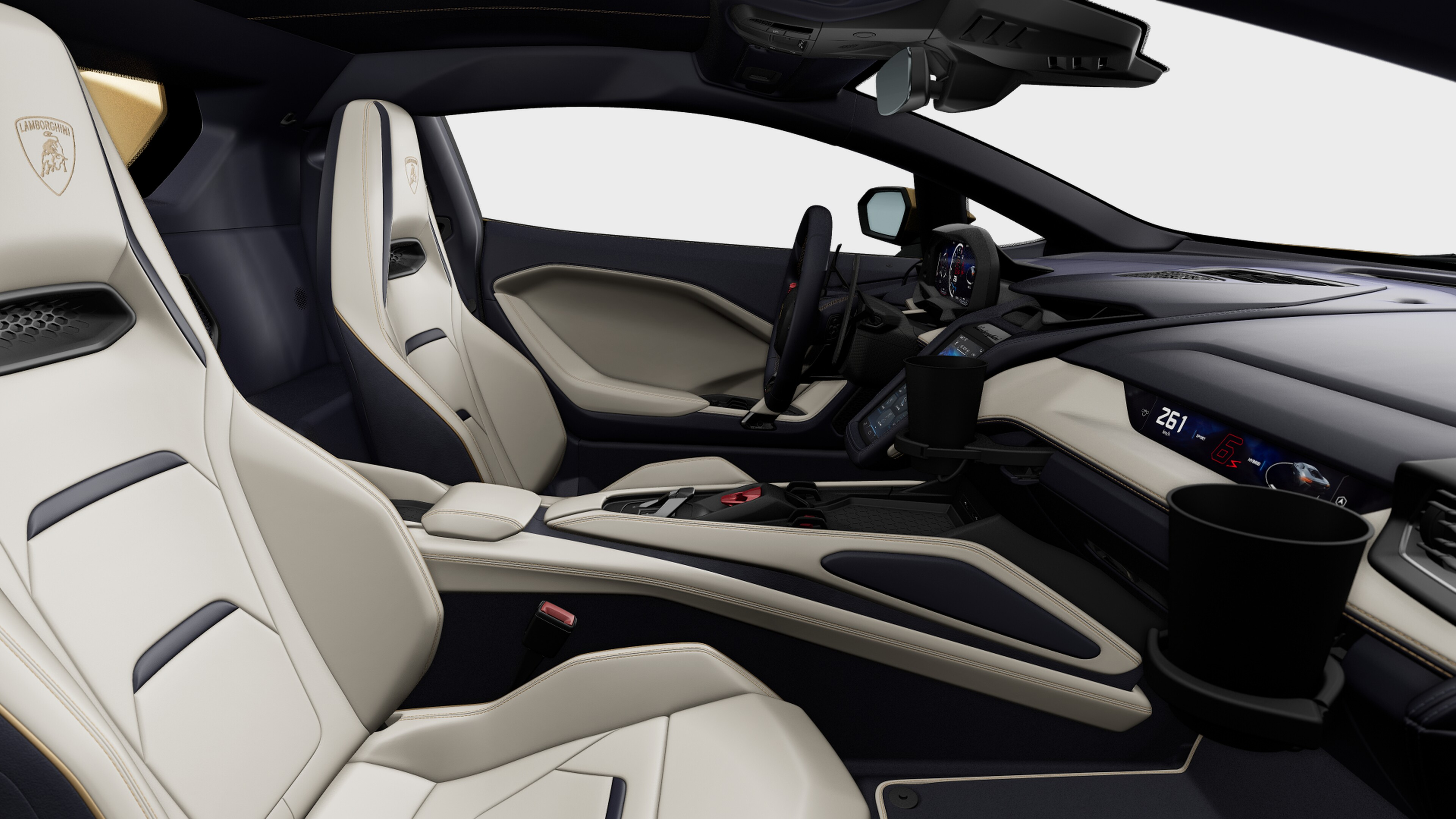 To keep things classy inside I went with the comfort seats and chose one of the Classica trims, with a mix of Blu Delphinus as the base leather color and Bianco Polar covering the seats and other elements. Again I got rid of all of the interior carbon, instead covering everything in leather with contrasting Oro Elios stitching and piping to match the exterior. I had to get the optional cupholders, of course, along with the passenger screen, high-end sound system, ambient lighting and full driver-assist suite to make this PHEV even more daily drivable.