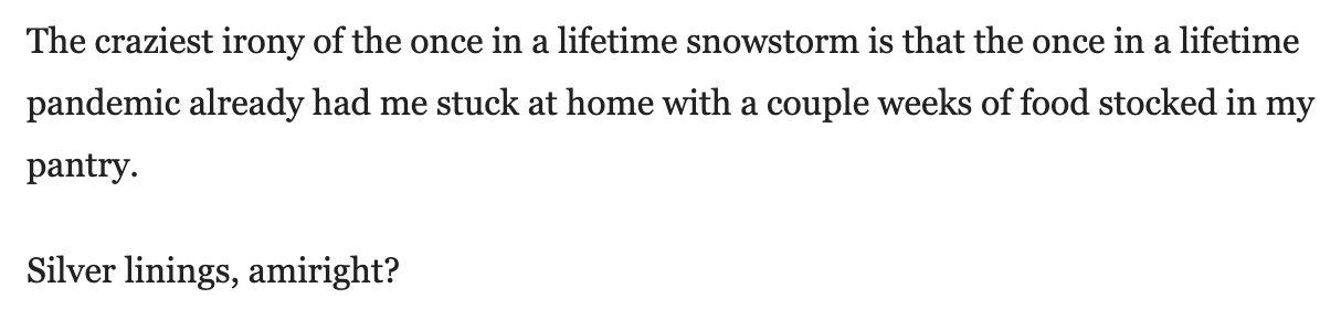 The winter weather affecting huge swaths of the country right now is wild. Millions are without power, roads are dangerous and the temperatures are plummeting with more snow on the way. People are huddled in their homes and, I hope, staying safe. We asked readers how they are handling the situation. With conditions like these, you can only try and make the best of it.