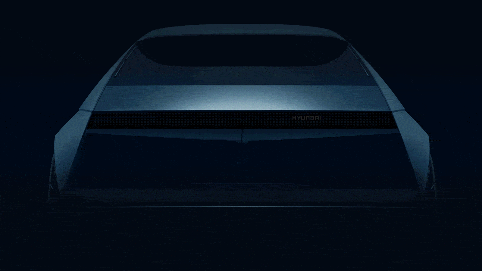 Prior to its official introduction at the Frankfurt Motor Show next month, Hyundai teased the rear of their new electric vehicle concept, complete with a nice big band of animated dot-matrix taillight goodness. The car is called 『45』 and it seems like those two bracket things are part of the concept car's official name.