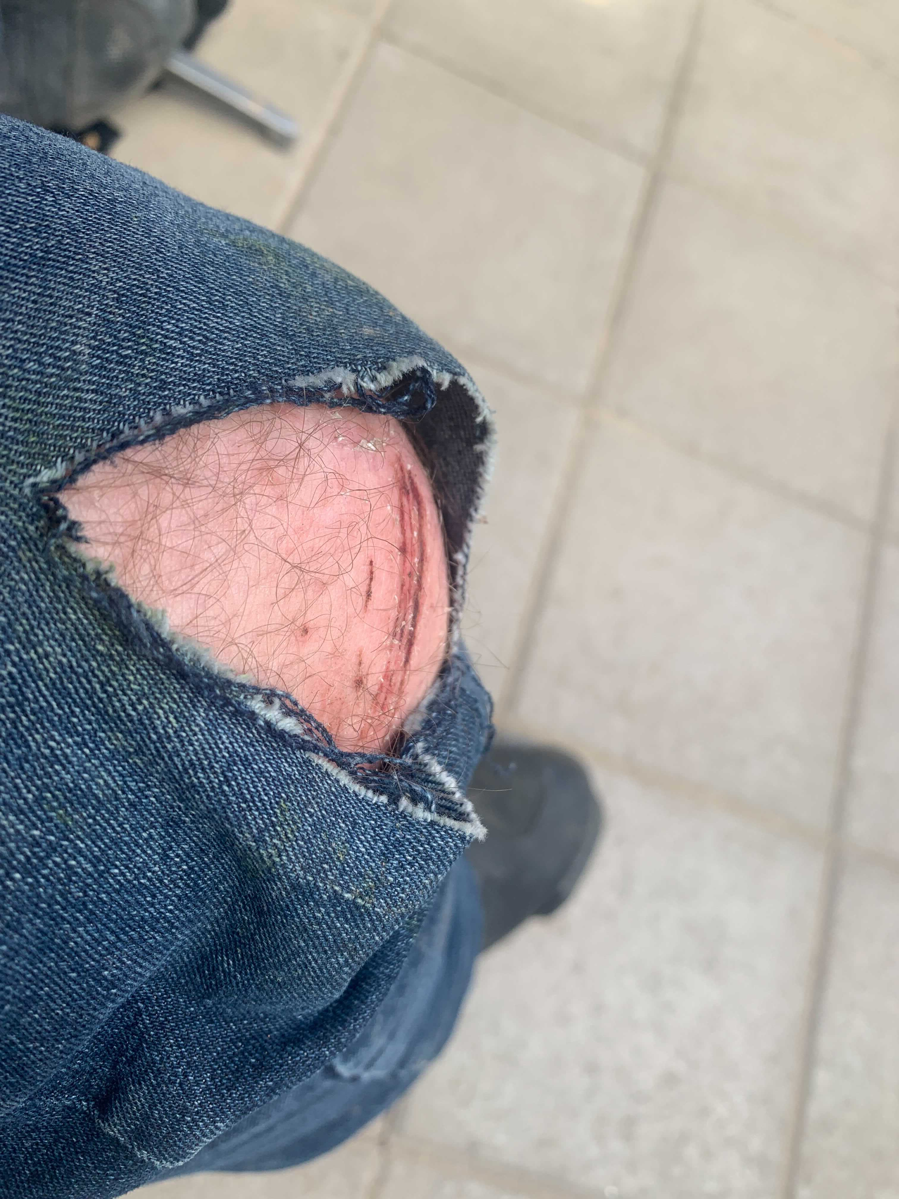 I didn't get off of the bike again, even amid checks from one of the other riders in our group who is a card carrying emergency medical first responder. It felt nice to sit still for a minute as my heartrate returned to the atmosphere. Cursory checks indicated I had not suffered a concussion, and in taking my jacket off, it looked like I'd gotten away with nothing more than some bruising and sore muscles. It was then that I began to feel the light scrape on my knee and saw the torn denim that had allowed it. If the only lasting damage from this incident was a scuffed knee, I got away lightly.