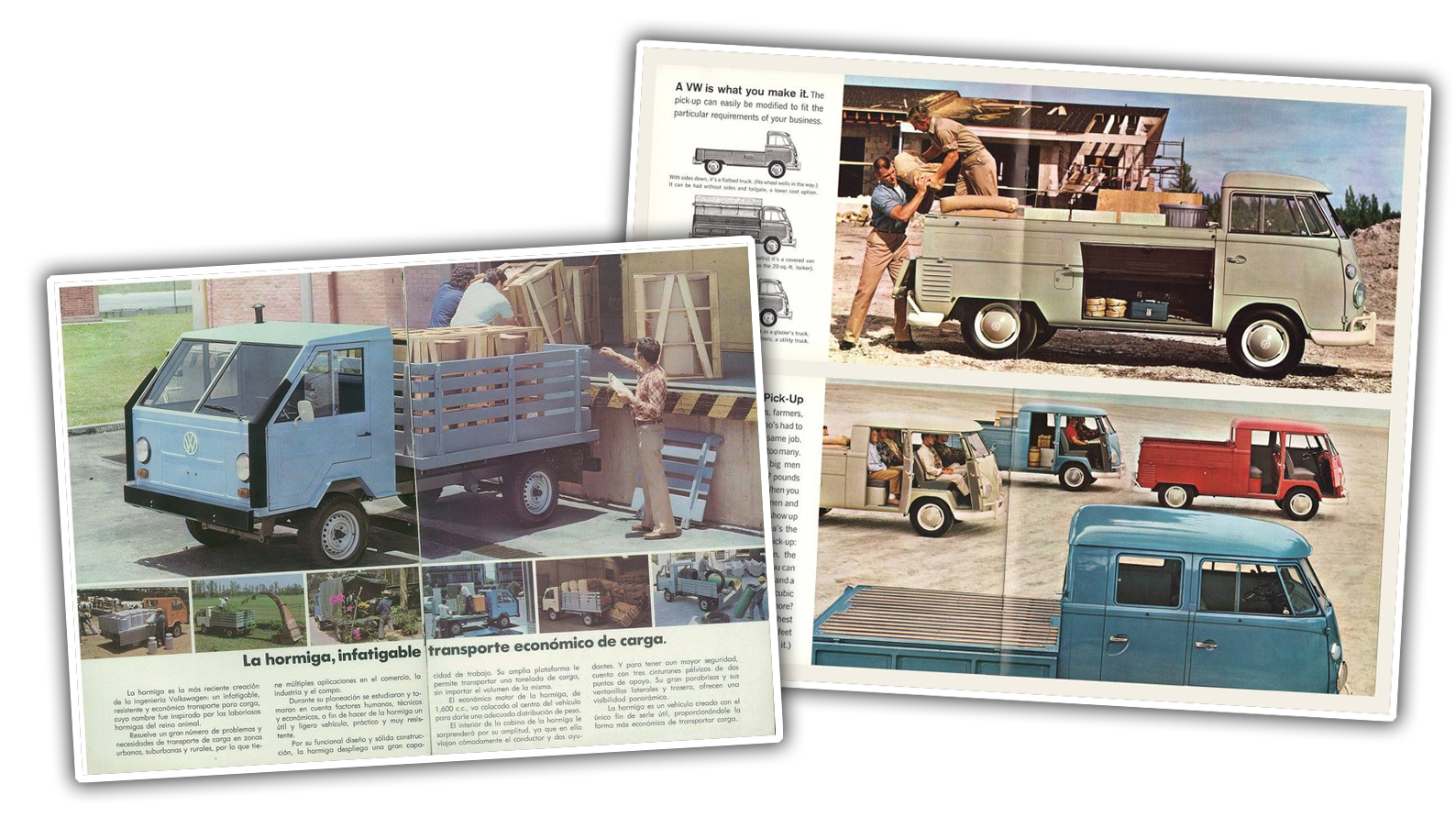 VW knew how to build rear-engined pickup trucks, since they'd been doing that with the Type 2 for years, and in Mexico they were even building a front-engined pick-up truck called the Hormiga that used the standard air-cooled flat-four engine just flipped around at the front of the cab.