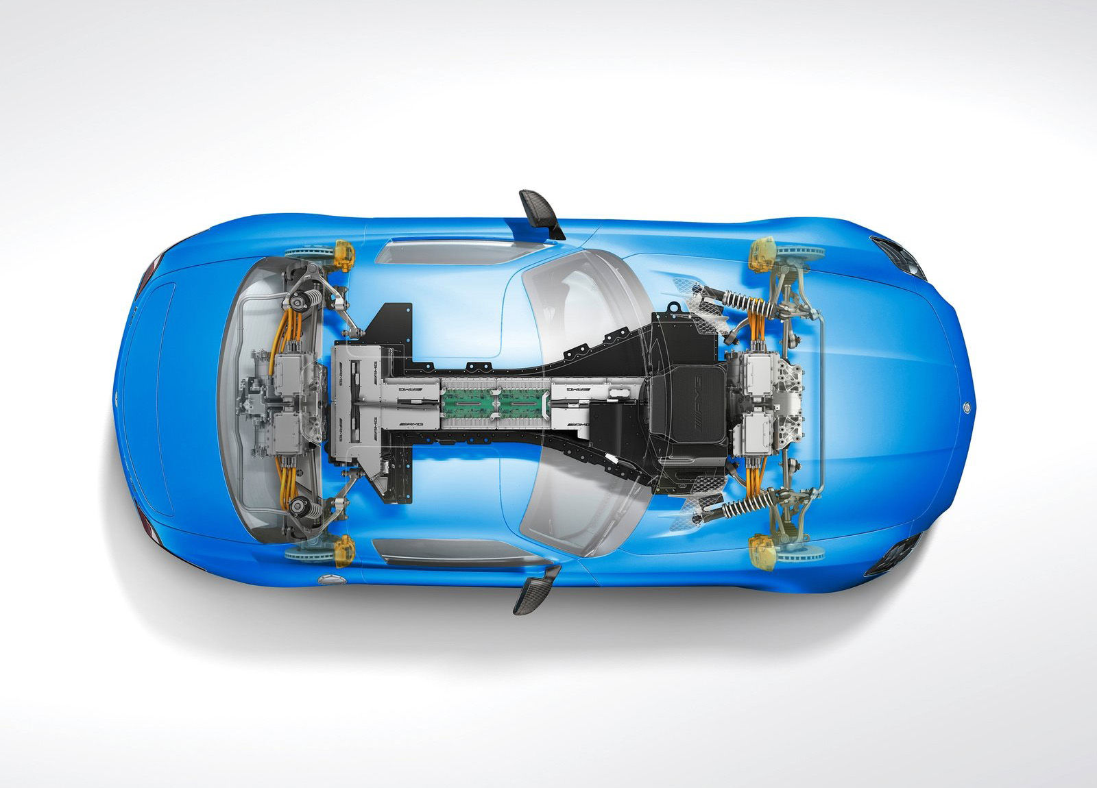For a supercar that's seemingly from another planet once you pop the hood, the SLS Electric Drive largely looks the same as any internal-combustion-powered SLS. The grille gets "bionic honeycomb-shaped" openings, and it and the adjacent air intakes receive body-matching paint. Paint aside, these openings are functional, feeding air to various cooling bits. Exterior colors are limited to the chromatic blue you see in the photos, an exclusive matte neon yellow called electricbeam, and four others. A new gauge cluster features in the electric SLS, and it replaces a tachometer with a display providing information on power requirements, regeneration status, transmission modes, and battery charge.