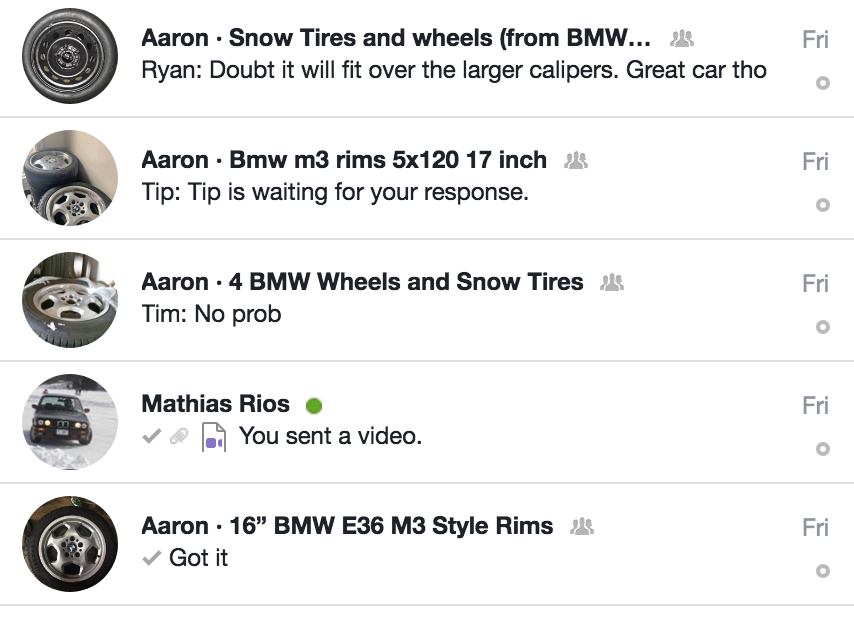 While I was deep in my search, the previous owner informed me that he had a set of E36 wheels laying around, but no rubber to mount them. After a bit of Facebook messaging and after I said I'd pay for it, the seller agreed to mount some rubber on the wheels so that I wouldn't have to deal with sourcing wheels and potentially fucking that situation up. Things were looking up.