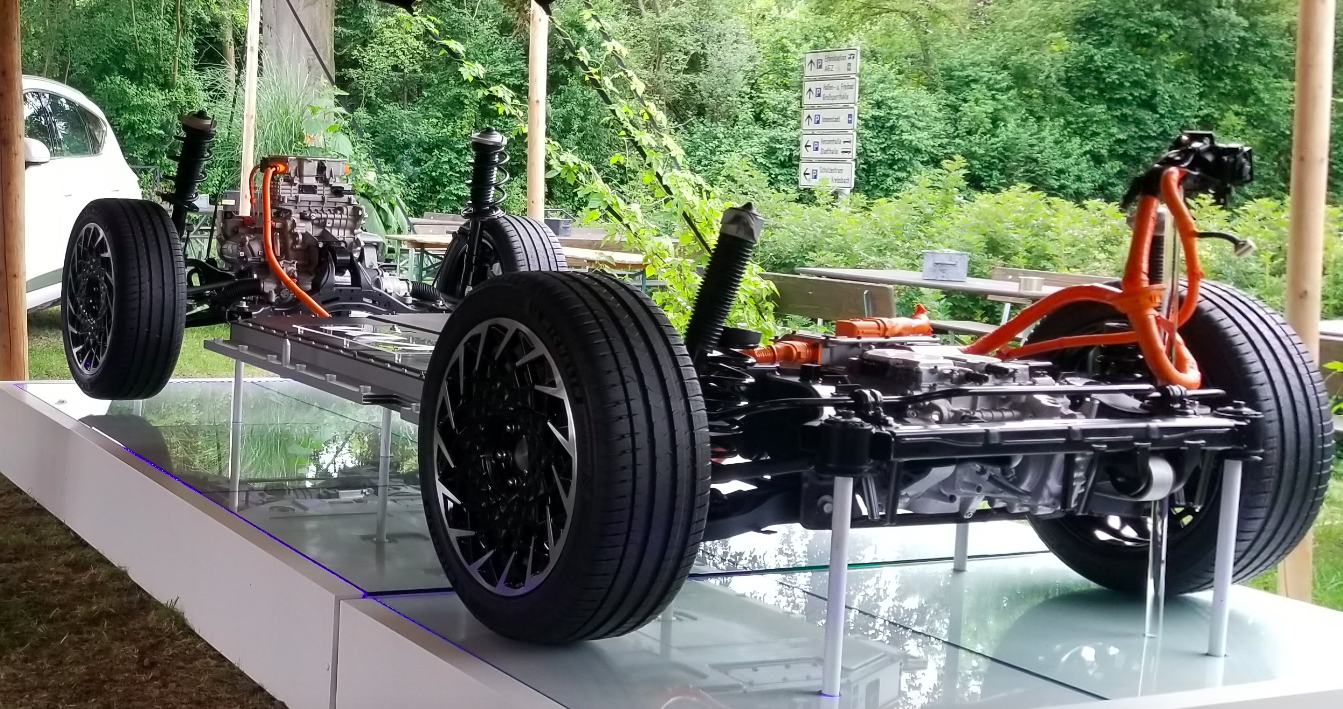 Things are oriented a bit differently in the rear, as the inverter and many of the power electronics are located ahead of the drive unit, not on top of it. I'm assuming Kia did this to allow for a spacious cargo area with a low load floor. In addition, the motor sits aft of the rear axle (i.e. the gearbox output is ahead of the motor's rotor axis).