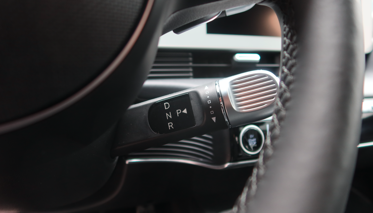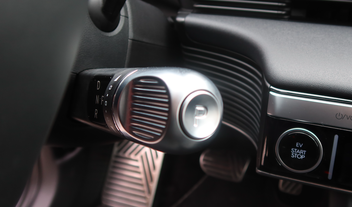 There are lots of things that I love about the Hyundai Ioniq 5's interior. I love the column-mounted shifter, for one. It's a great way to use space that would otherwise go wasted, and it's intuitive to use. You twist the silver end of the shifter stalk clockwise for drive and counter-clockwise for reverse, and you press the button at the end to put the vehicle into park.