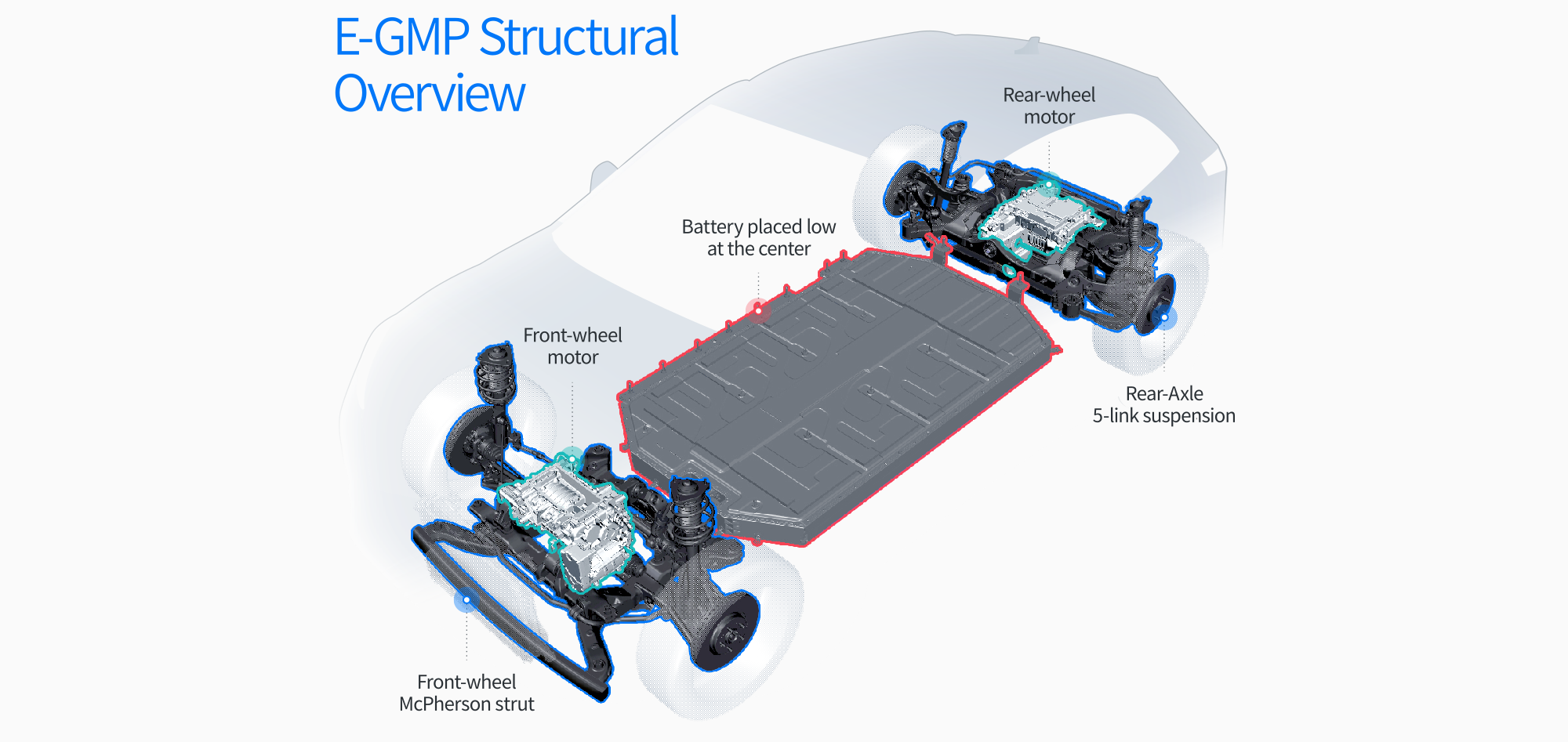 As is typical in this segment, Hyundai and Kia's E-GMP platform uses a MacPherson strut setup in the front and a multilink suspension out back. The 58 kWh and 77.4 kWh battery packs use Nickel-Cobalt-Manganese (in ratios of 80 percent, 10 percent, 10 percent, respectively) pouch cells.