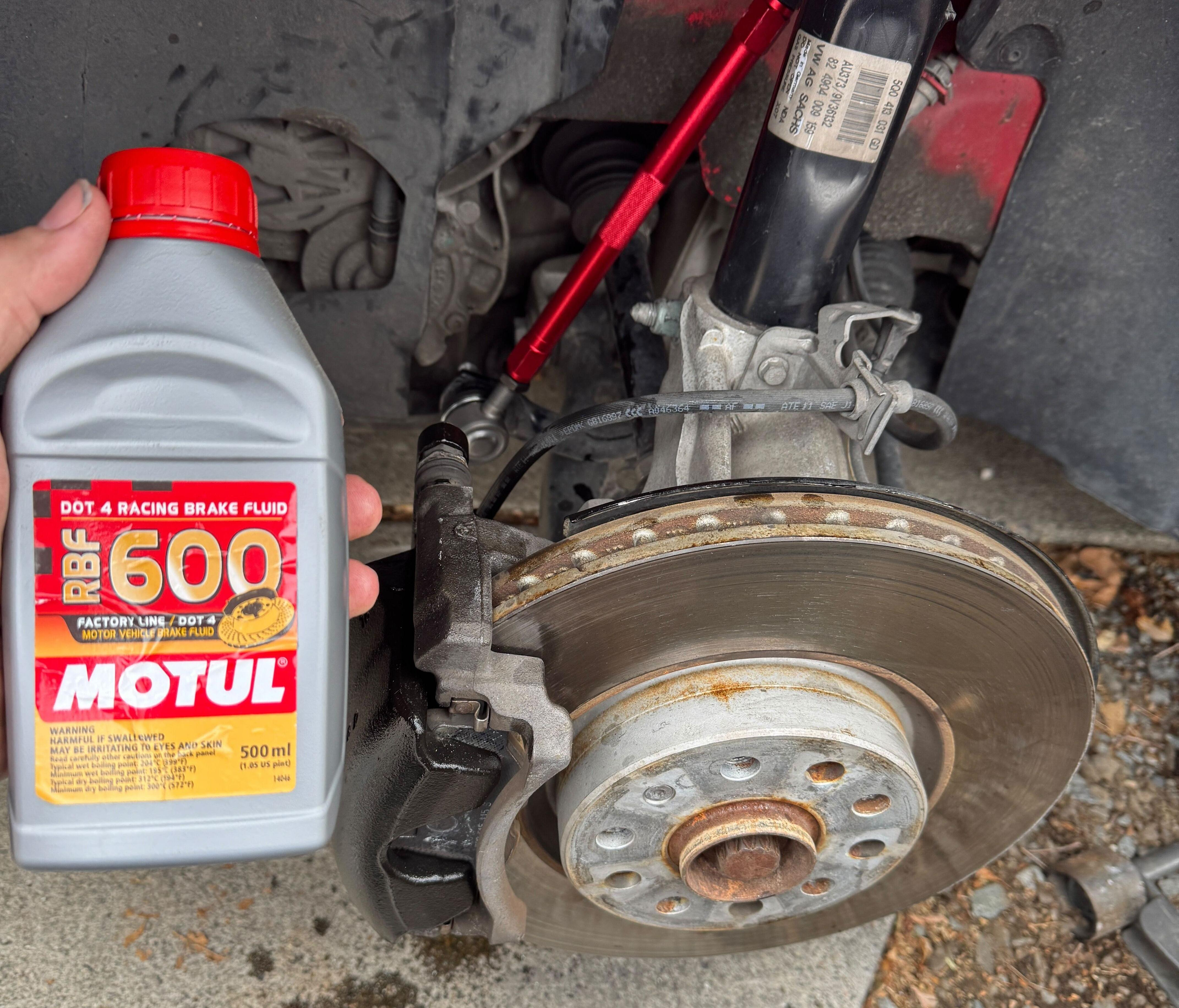 If you have been following this suspension saga, which I somehow managed to stretch out into three separate blogs, you'll know that I seriously fucked up when I finished the driver's side front corner. A $170 rebuilt caliper from NAPA put everything right again, and the install and bleeding process was a total breeze. Instead of running a power bleeder or having my wife push pedals all afternoon, I simply cracked the bleeder valve on the new caliper, topped up the primary cylinder with fresh Motul Resting Bitch Face from my stash and let gravity do the job for 15 minutes or so. Then I hooked up the one-person bleeder bottle to the valve and gave it a single pump on the pedal to confirm all the air had been released. I was really worried about it, but it could not have gone more smoothly.