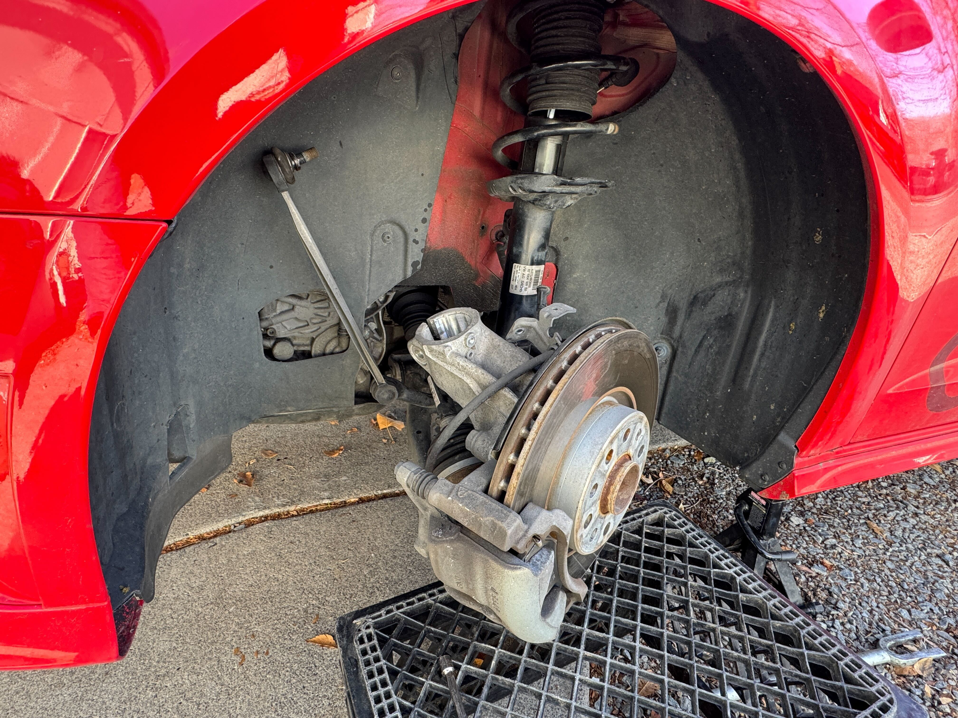 Installing lowering springs is a pretty straightforward DIY task if you're at least moderately handy with a wrench. The rear springs went in super easily once I figured out the proper method of disconnecting the lower control arm, but the fronts fought me a little more. On this particular car it involved extracting the front strut from the upright assembly, and in order to get the upright low enough to remove the strut from its clamp meant unbolting the ball joint, disconnecting the CV axle and swaybar, and lightly rocking the hub while pushing downward. For some reason the driver's side took about two hours, but the passenger's side took 20 minutes. Sometimes that's how it goes.