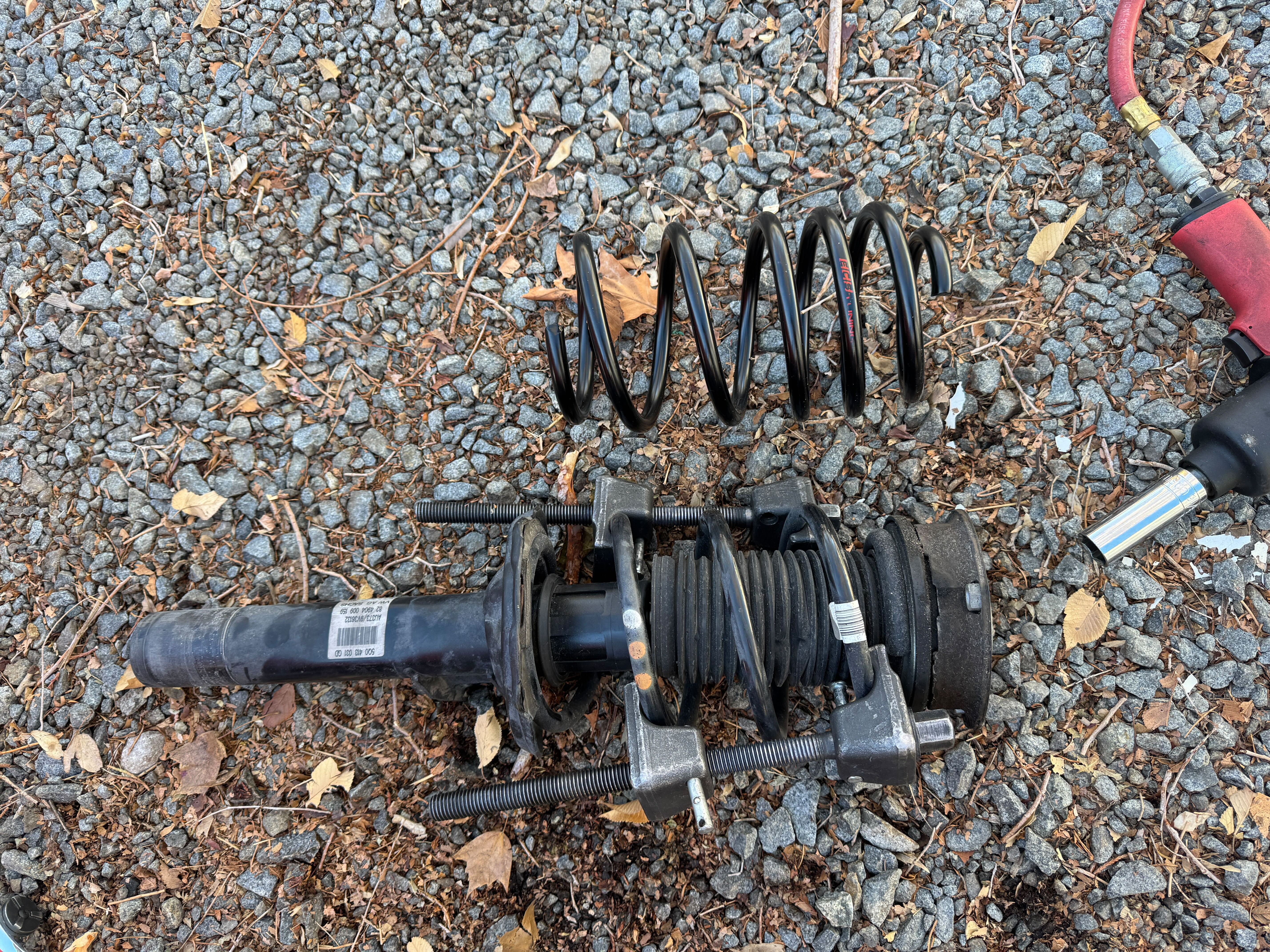 A lot of people are afraid of this style of McPherson strut spring compressor. If you treat them right and don't stick your hands inside the tensioned spring, you're probably fine. I've never personally seen one fail, but there is definitely a lot of potential energy bound up in the above image and if poorly handled could shoot your eye out, kid. I find that using an impact gun is the easiest way to handle these things. Line them up correctly on the spring and send it, but make sure you're applying even ugga duggas to both sides. Once the spring is compressed you can remove the top nut and slowly loosen the spring back to its full height. Pop the new spring on, re-install the strut top, and Robert's your mother's brother.