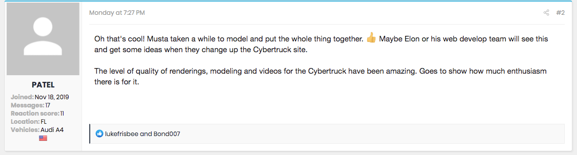 The thread concerns Tesla's Cybertruck web page, which the forum members seem to think isn't interactive or engaging enough. As the site Admin puts it,