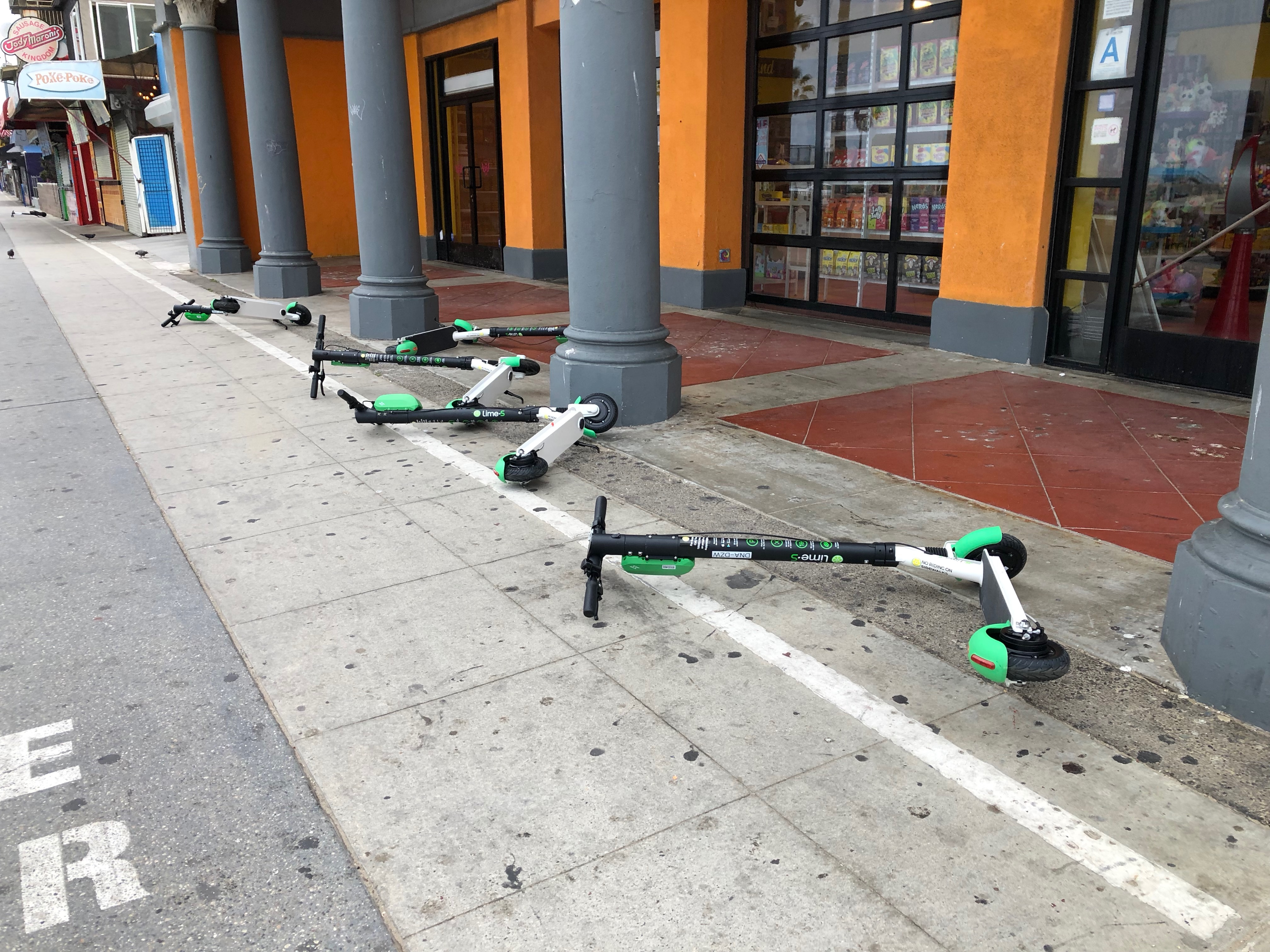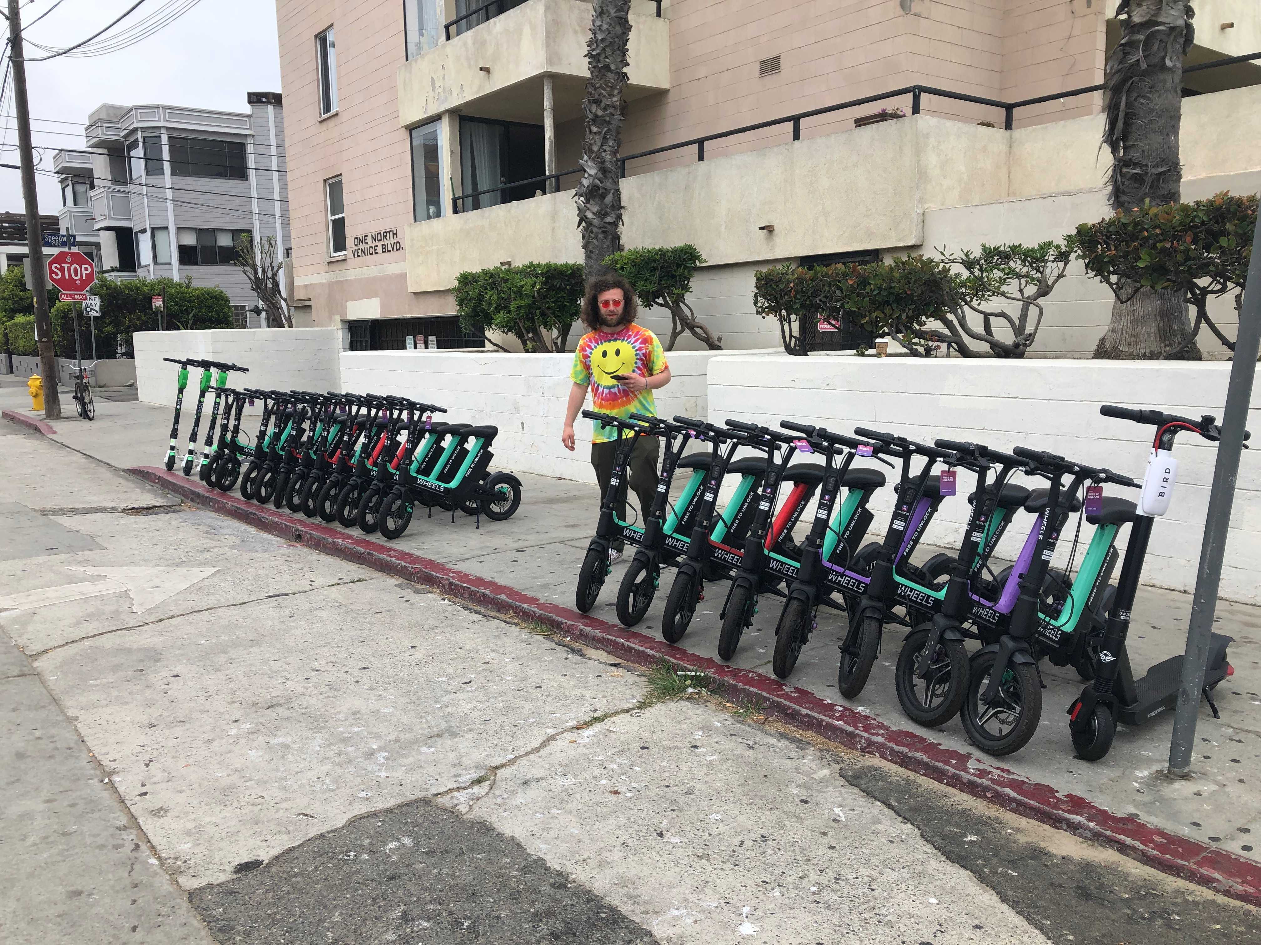 Bird Scooters became litter. Freelance chargers, or "Juicers" as Lime would later call their not-employees, would do their best to place the scooters in an orderly fashion, out of the way in common areas. But since people only have respect for a.) things they, themselves personally own or b.) are locked down or are being watched, kicking, destroying, throwing them in the ocean, and more turned into Venice's favorite new sport. The other morning, I watched someone line up a dozen or more scooters neatly, get into their van, and drive off. Not 10 seconds later, someone used a shopping cart as a bowling ball, turning the whole thing into some kind of bramble.