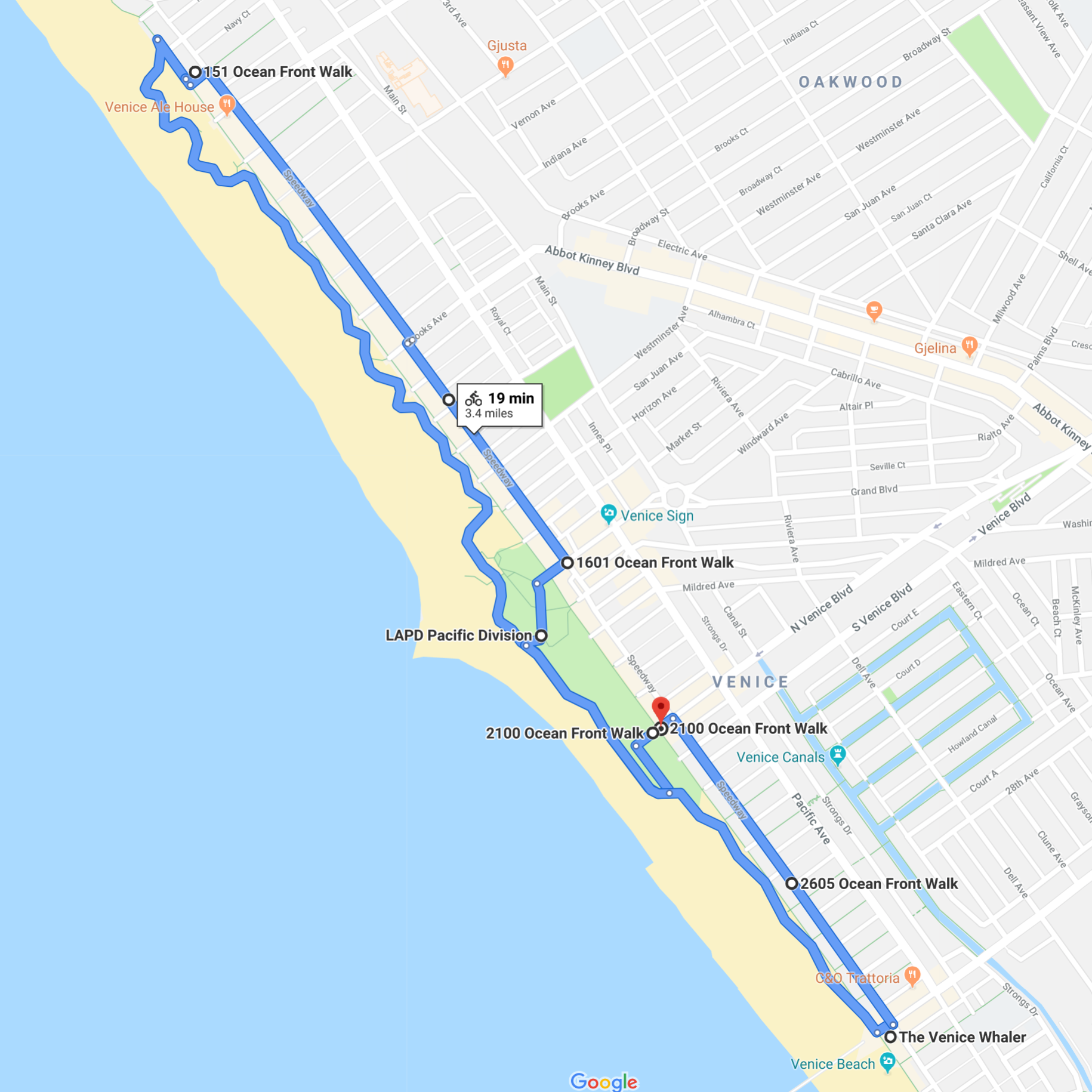 You ride south on Speedway, basically a decaying alley full of potholes, but appropriately named, as it was LA's first paved road. Take Speedway south to Windward Avenue, the heart of Venice, and turn right, weaving across the freestyle dance skating grounds, through the throngs of tourists, and back to the bike path where it meets the legal graffiti area. Continue south on the bike path until you get to the Venice pier, then turn left on Washington Blvd and an immediate left to go north on Speedway, taking you right back to Start/Finish.