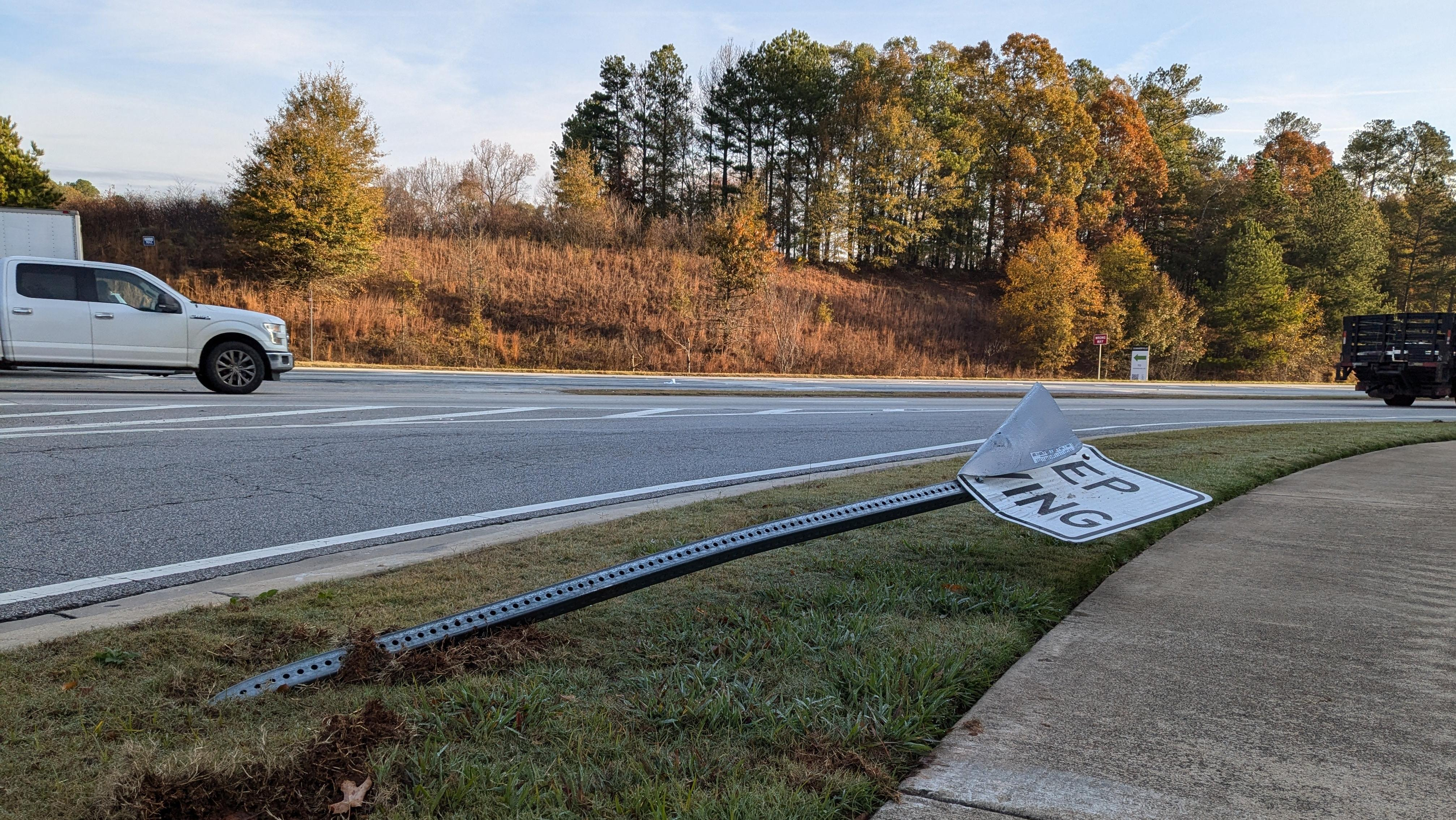 You aren't supposed to run over road signs, folks.