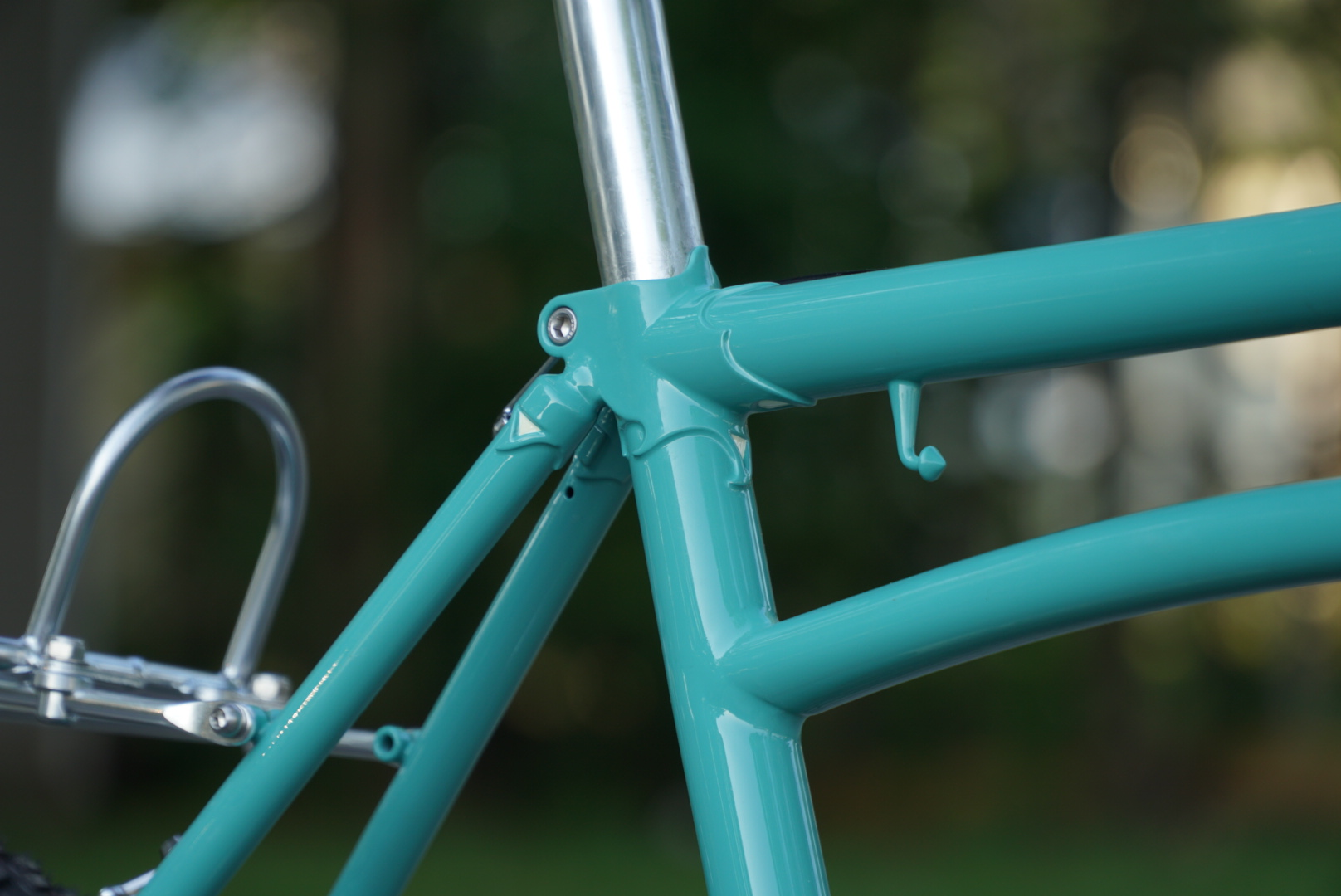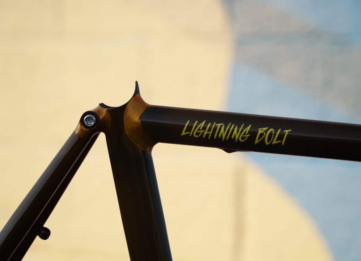 Here, by contrast, is that same top tube-seat tube joint on a Crust Lightning Bolt, $1,350 for the frame alone. It is fillet-brazed and, conveniently for us, the braze itself hasn't been painted over, so you can see the bronze smoothly joining the tubes: