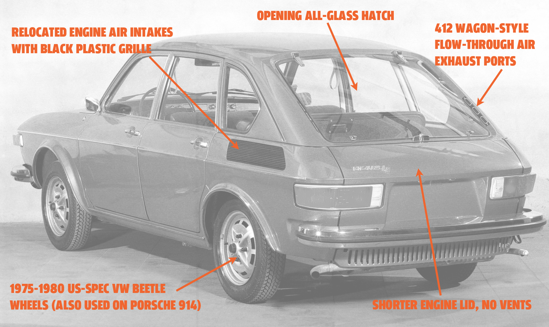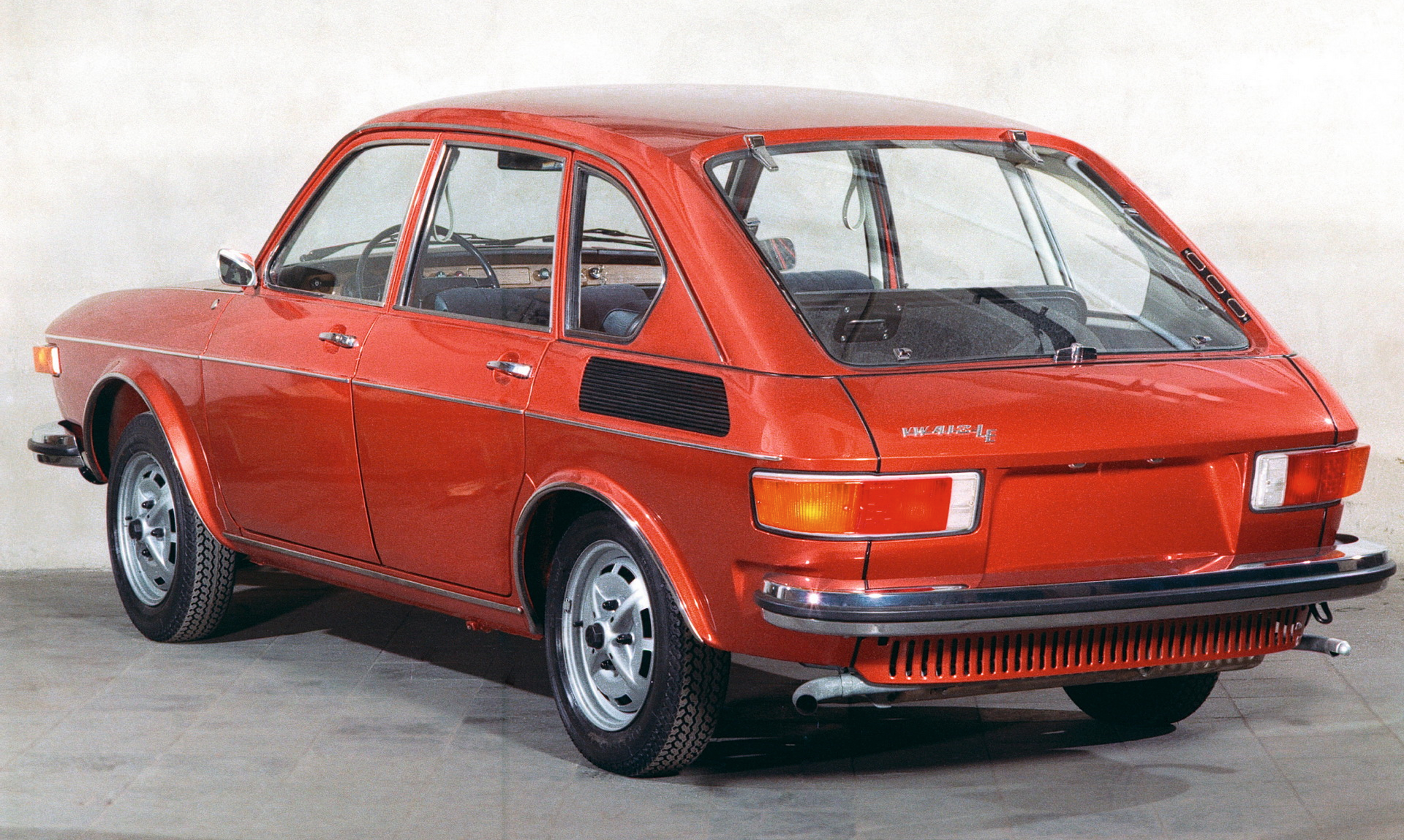 The car shown in the image is badged as a 412 LE, but there were no production 412 LEs like this. It has wheels that were used on Beetles (and Porsche 914s) from 1975 on, a year after Type 4 production stopped.