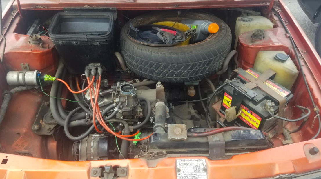 Milenko was working in a parking spot on the side of the road near Dragoslav's apartment, cleaning his Yugo 45's spark plugs. The Yugo 45 was a bare-bones model not sold in the U.S. — it didn't even have power brakes! Seriously, there's no brake booster to be found in this engine bay; in fact, there's barely an engine to be found here (the 45 horsepower 900cc four-cylinder is tiny):
