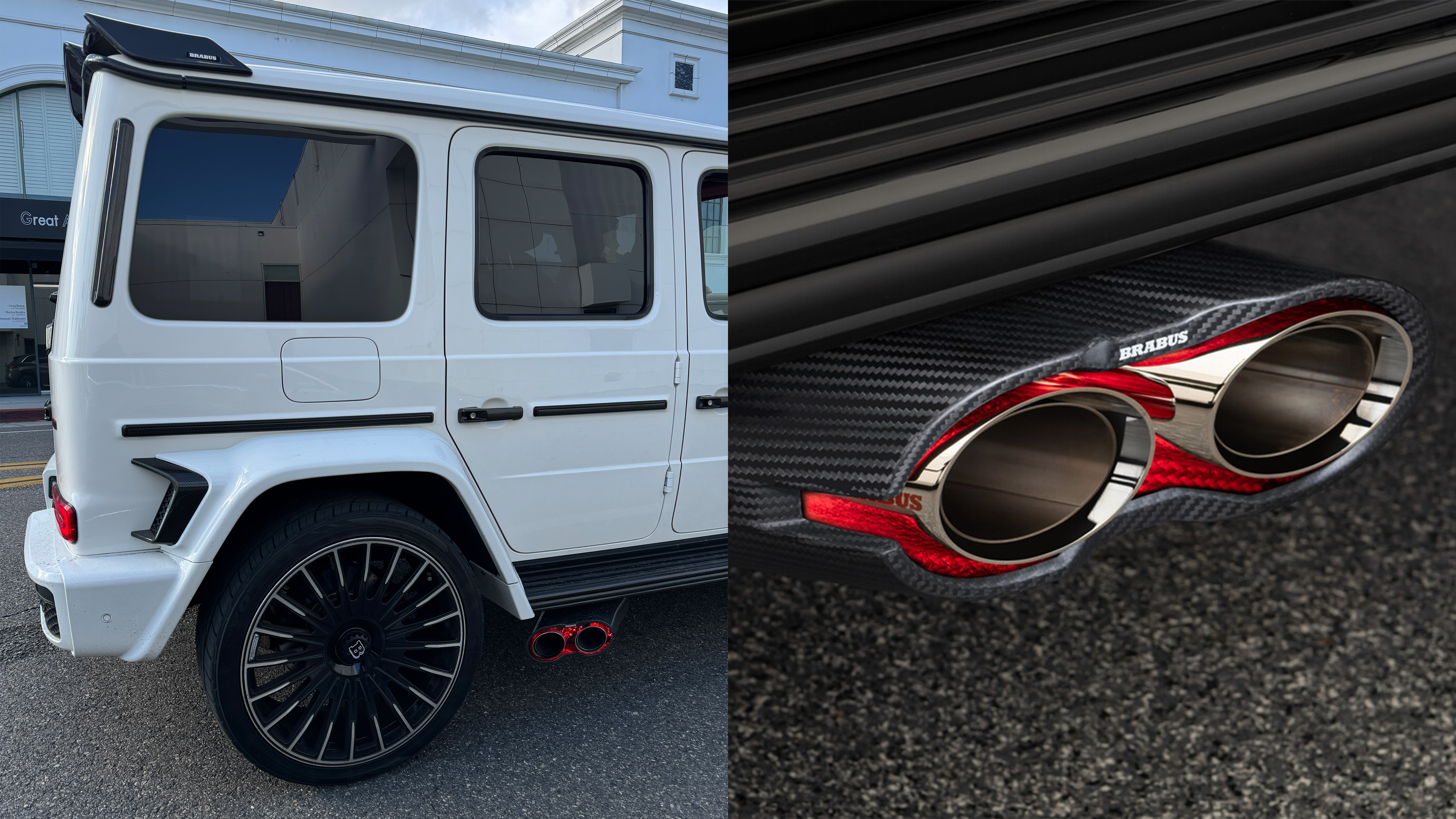 Yes, you read that right. First introduced on Brabus' fastest and most absurd Rocket models, you can opt for larger side-exit exhaust tips that have a carbon-fiber surround and a ring of red LED lights set around each tip deeper in the surround. Brabus calls it the Rocket Launch Ambience Light, and in addition to the lights, it features increased performance over the stock exhaust and active flaps that provide a quiet "coming home" mode. As you can see from this Brabus 800 I saw the other day — the mid-range tuning package for the AMG G63 — the red glow is very noticeable, even during the daytime.