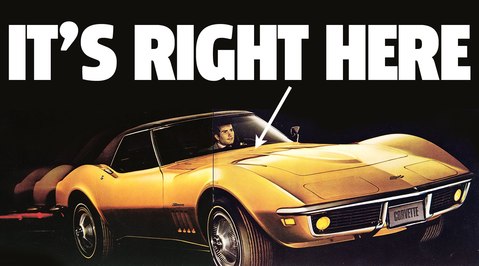 The particular Corvette is an early C3 'Vette, like the ones made from 1968 to 1972, a period that coincides with when American carmakers all somehow decided that windshield wipers were shameful things that needed to be hidden.