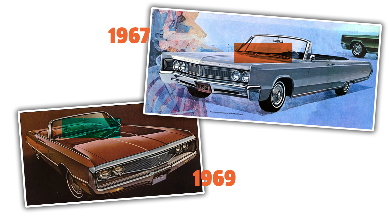 See? The '67 wore its wipers boldly, unashamedly, while the '69 modestly tucks them under a hood with a raised lip to shield the wipers from view.