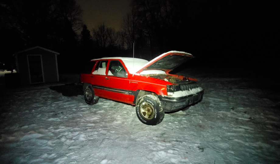 The red Jeep was literally frozen to the ground. Dustin had to yank the thing with his JL Wrangler to get it unstuck. We had to carefully tow both machines around my house, with me turning their steering wheels and having a wood block at hand, ready to throw it under a tire in case either ZJ wanted to roll into Dustin's Wrangler.