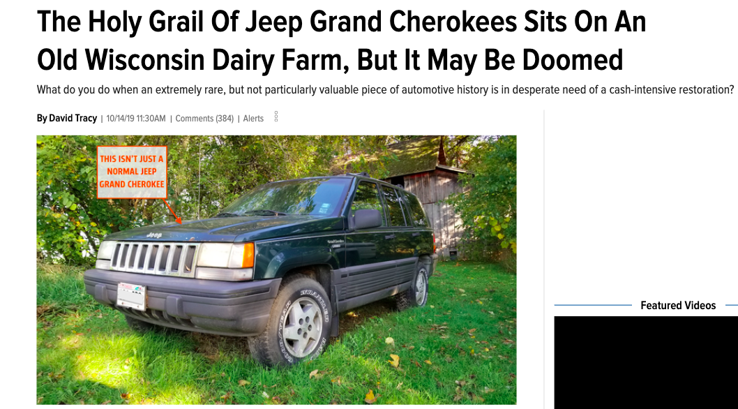 The first machine in question is famous. I wrote about it back in 2019 (see image before the one above) — a rare manual Jeep Grand Cherokee about to bite the dust after a few too many salty winters in Wisconsin. "What should the owner do?" I asked readers before stating that the piece of American automotive history deserved better than to be crushed. Even though nobody besides me seems to give a damn about manual Jeep Grand Cherokees ("Rare does not mean desirable," many commenters wrote), I still somehow convinced a quarter million people to read the article about the hard-to-find Jeep on death row on an old Wisconsin dairy farm.