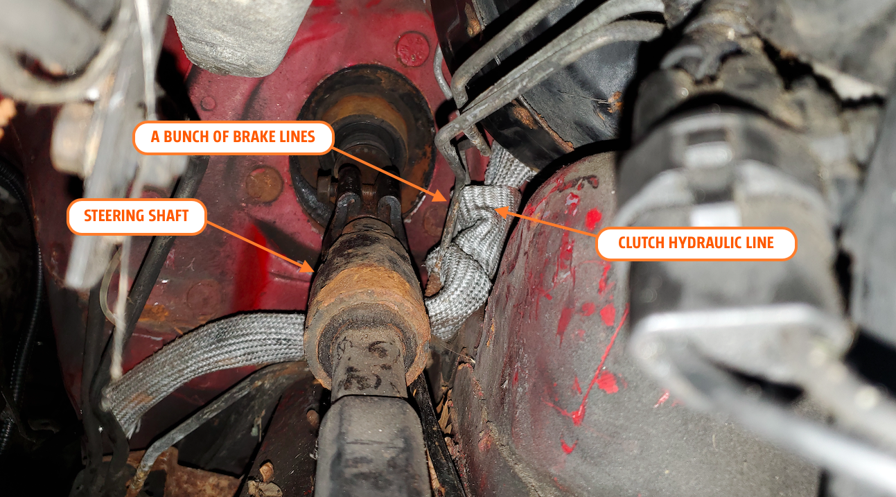 Still, getting the clutch hydraulics in wasn't easy. We had to unbolt the steering column from the firewall, and we had to undo the steering intermediate shat at the steering box to allow us to snake the hydraulic line under. It's not a great design by Jeep.