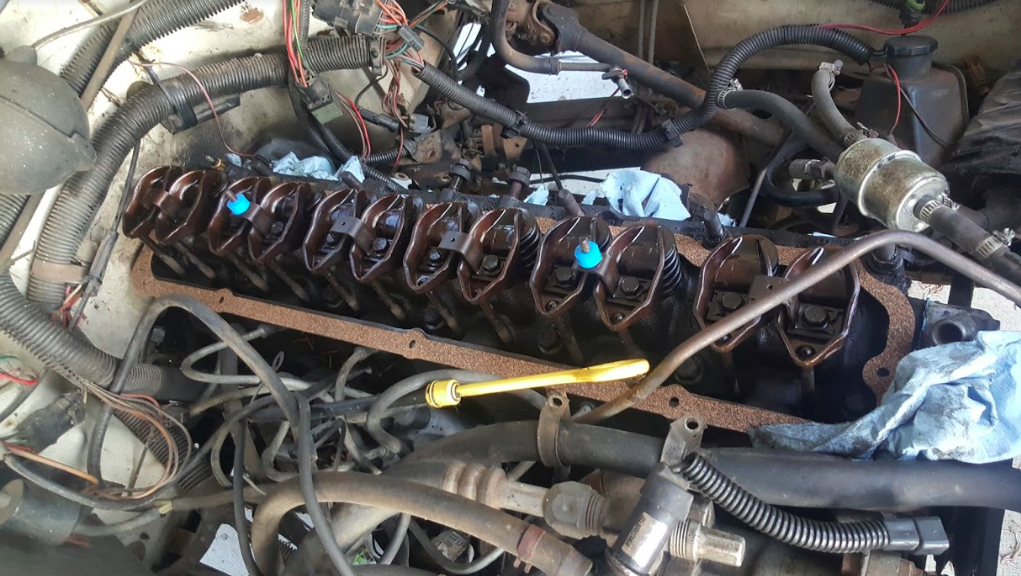 The 258 AMC Inline Six leaked buckets of oil, and much larger volumes of exhaust. To fix this, my friend and I cleaned the valve cover and replaced its gasket, and then I installed an exhaust manifold gasket, which actually wasn't included from the factory (it was just a metal-to-metal interface).